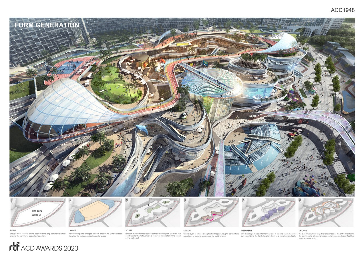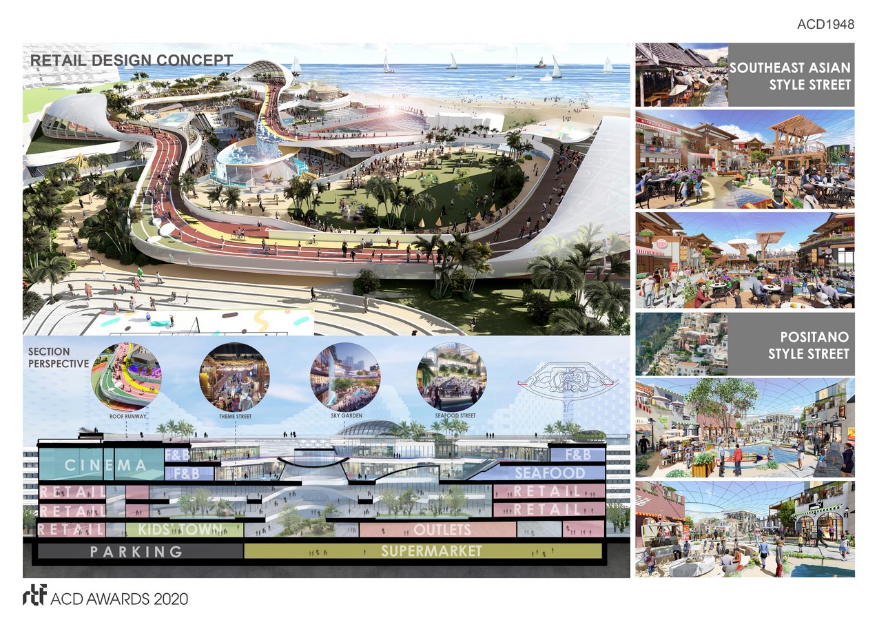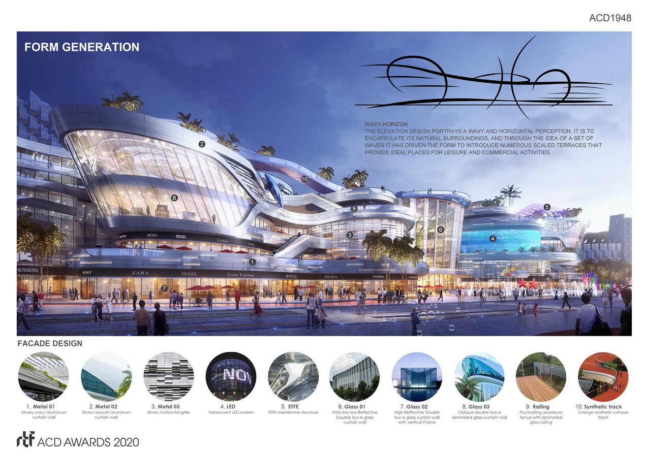 In the large coastal amusement park, the design reflecting the dynamic oceanic scenery and the great shopping experience. The wavy curve faรงade and the undulating recessed platforms, combined with a curved interface to create a terrace together with the wavy rooftop forming a dynamic spacing for the project.