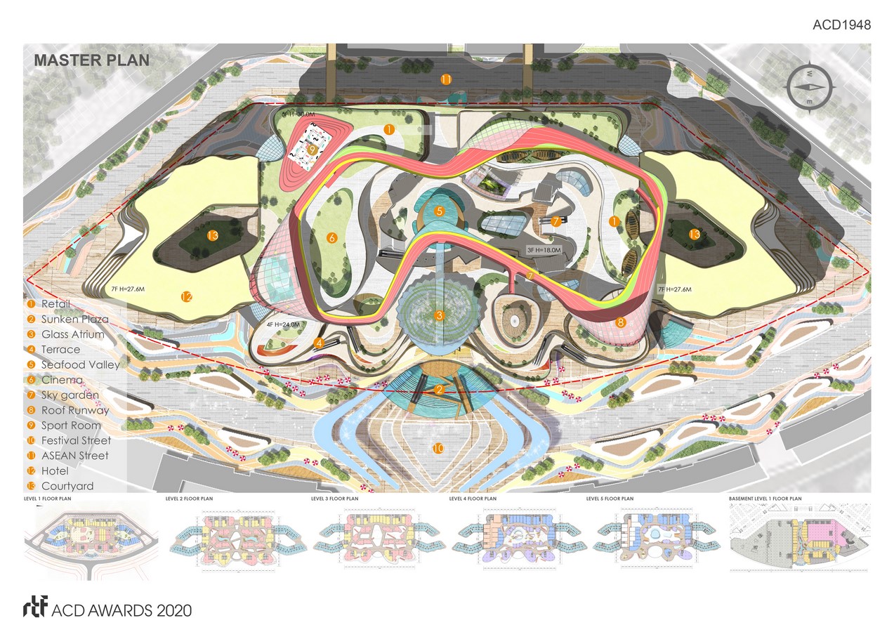 The five-story shopping mall is divided into three sub-areas: Outlets and Kid’s Street is on the 1st floor, closely connected to the outdoor plaza, creating a “Disney-style” shopping atmosphere.ย The indoor Themed Shopping street is set at the 2nd and 3rd floor, with 12m floor height.ย The two groups of different styles small buildings in the north and south combine with the landscape treatment to create a unique scene-like style water street to form the interior of the building. The 4th and partial 5th floor are seafood street, features a semi-outdoor โroof canyonโ, combined with a โseascape runwayโ, series of sports facilities and some retail shops.