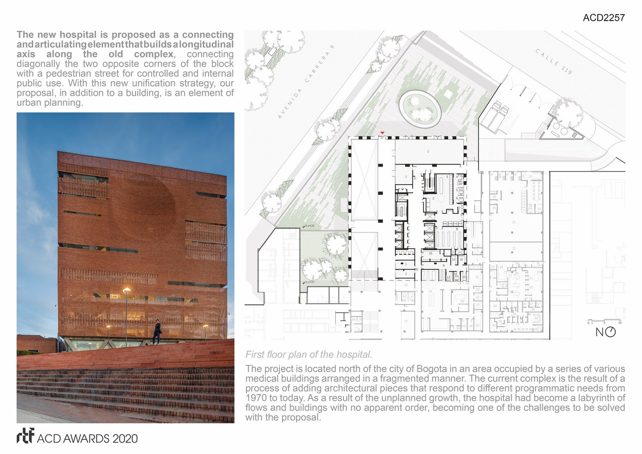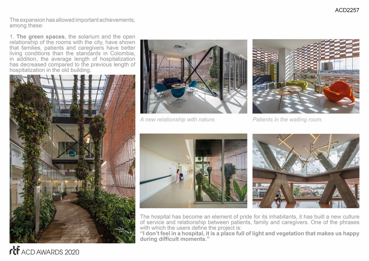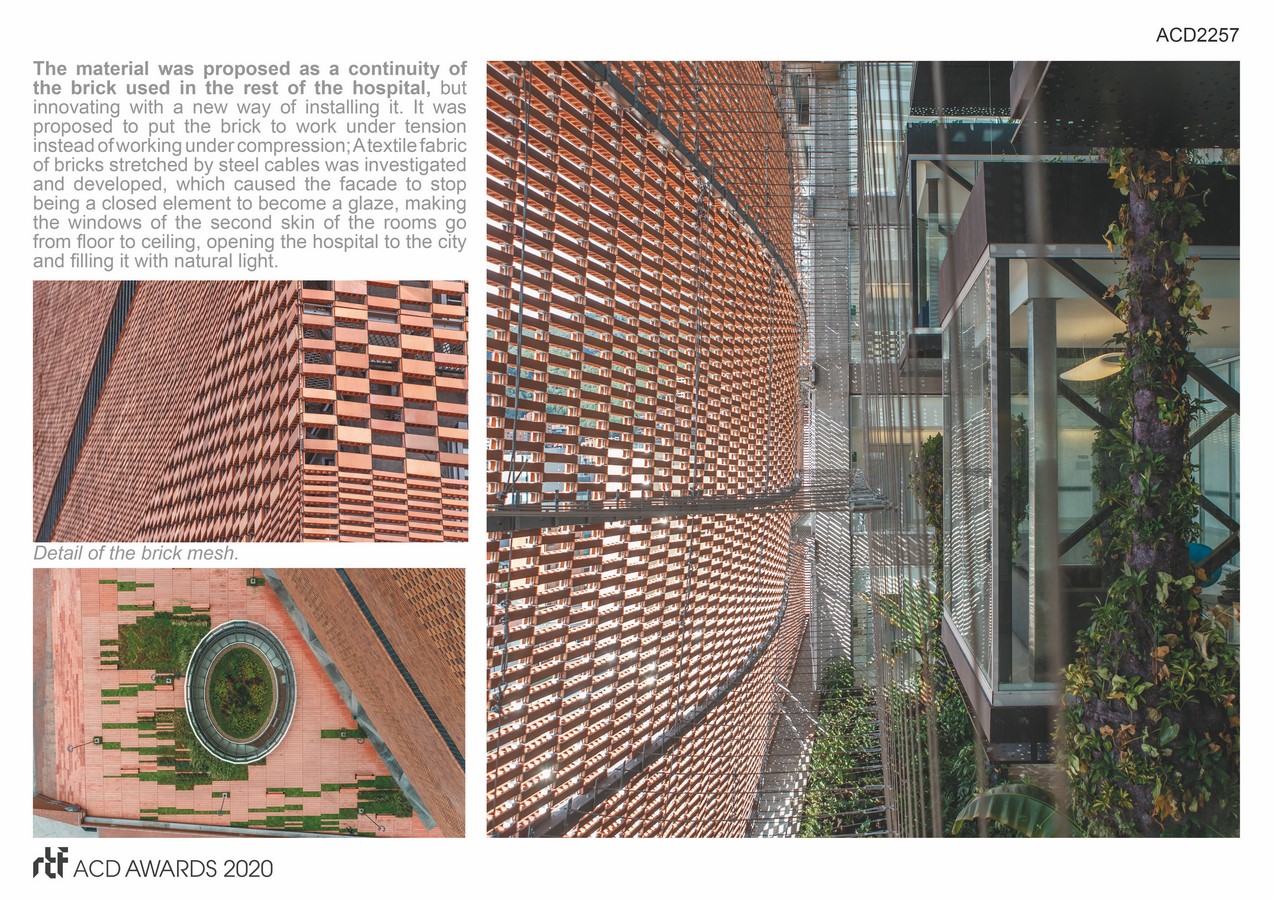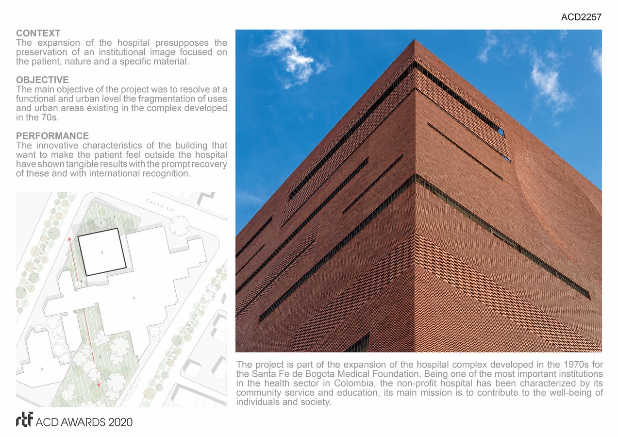 The building was conceived as an expansion of an existing hospital which values are patient oriented and that has an important iconic image to maintain in the city as a strong institution that sees for the whole wellbeing of Colombia. Brick has characterized the hospital since its beginning; the idea was to represent all of these ideas in a single building that described the hospital´s values as a whole.