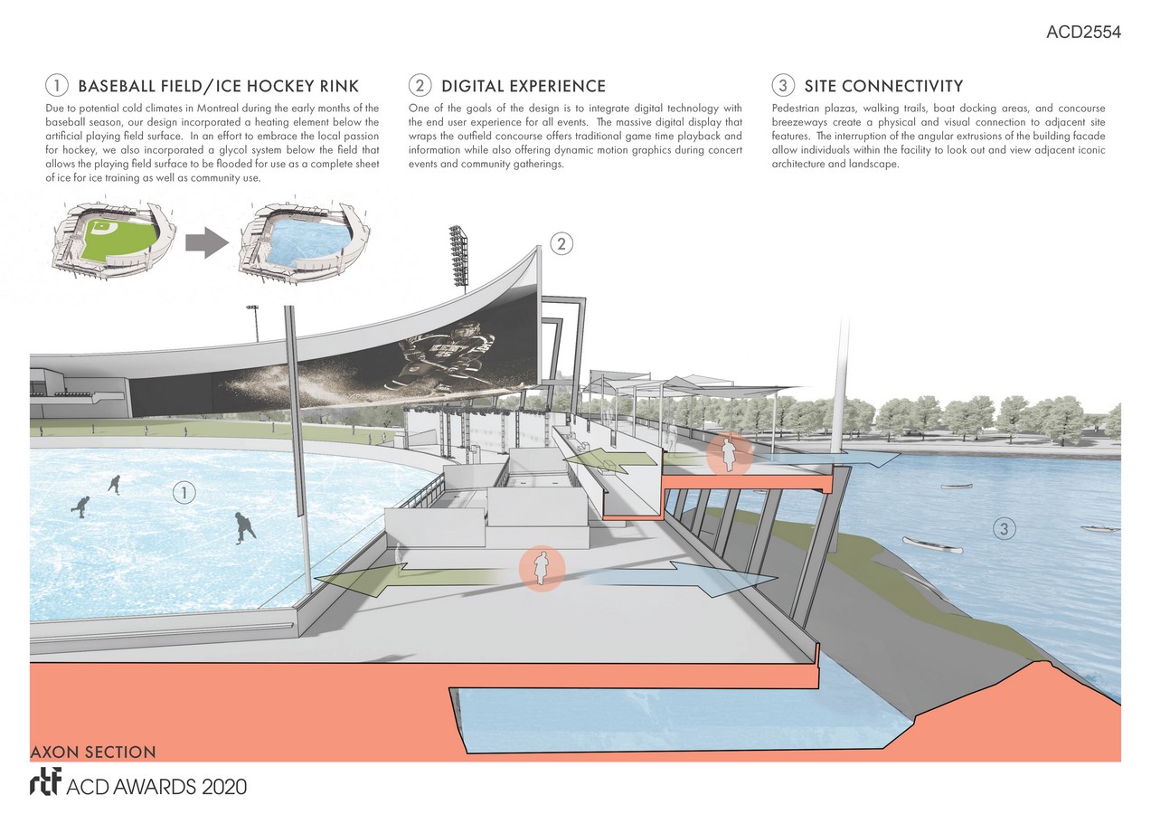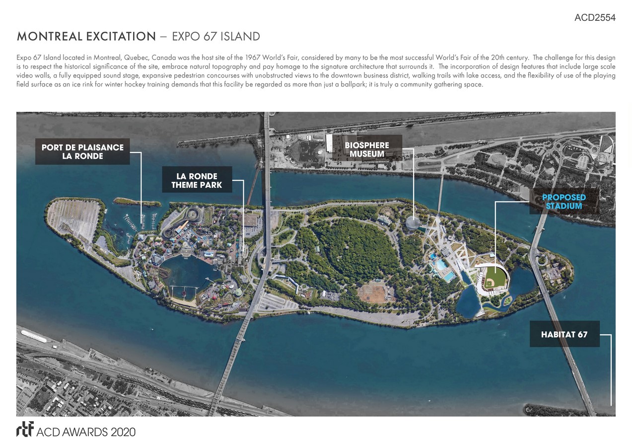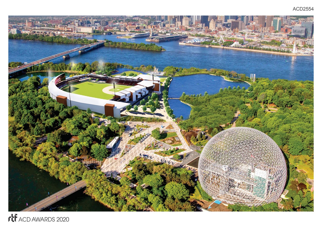 Expo 67 Island located in Montreal, Quebec, Canada was the host site of the 1967 World’s Fair, considered by many to be the most successful World’s Fair of the 20th century. The challenge for this design is to respect the historical significance of the site, embrace natural topography and pay homage to the signature architecture that surrounds it. The incorporation of design features that include large scale video walls, a fully equipped sound stage, expansive pedestrian concourses with unobstructed views to the downtown business district, walking trails with lake access, and the flexibility of use of the playing field surface as an ice rink for winter hockey training demands that this facility be regarded as more than just a ballpark; it is truly a community gathering space.