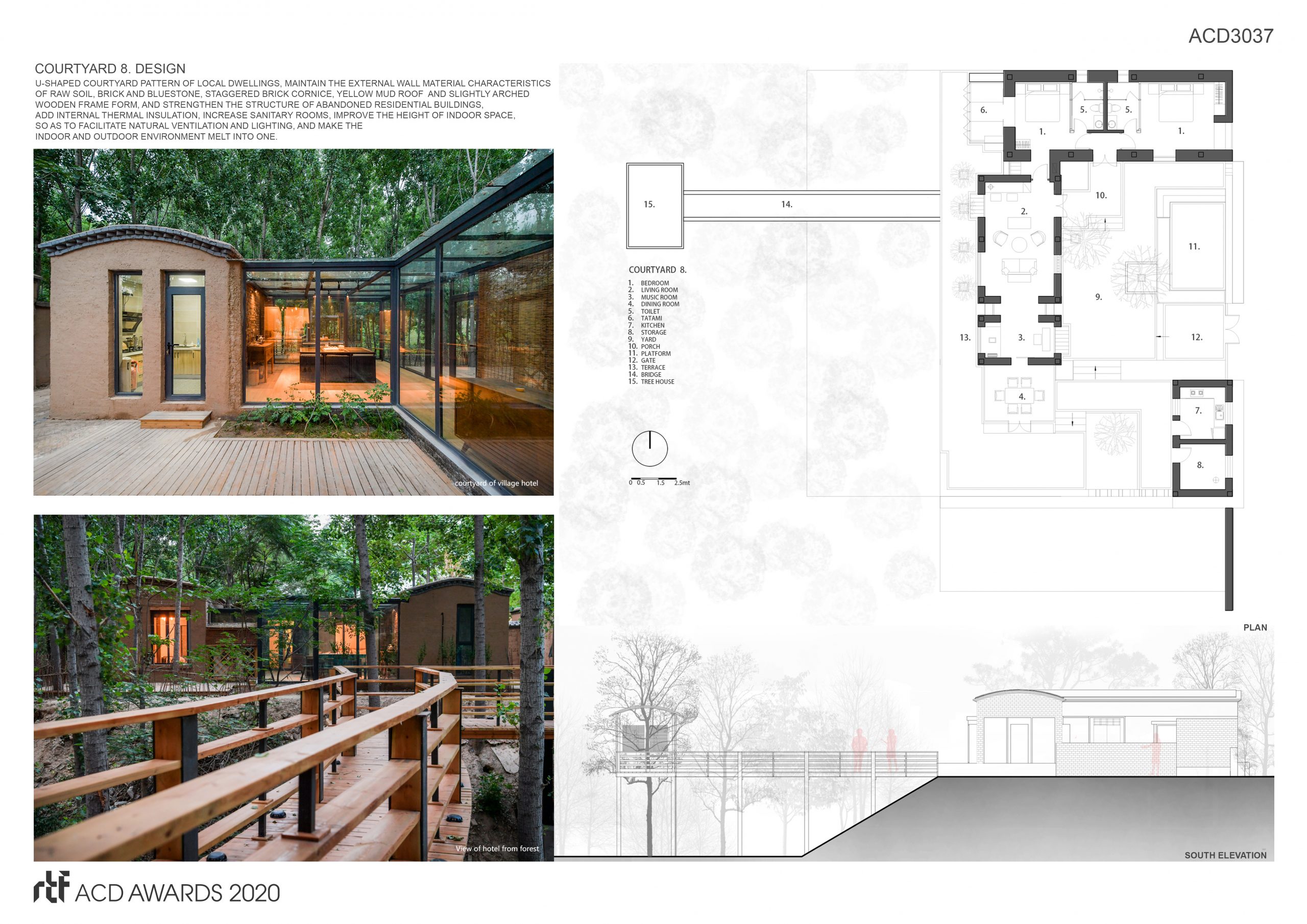 The renovated buildings continue the L-shaped and U-shaped courtyard pattern of local dwellings, maintain the external wall material characteristics of raw soil, brick and bluestone, staggered brick cornice, yellow mud roof and slightly arched wooden frame form, and strengthen the structure of abandoned residential buildings, add internal thermal insulation, increase sanitary rooms, improve the height of indoor space, so as to facilitate natural ventilation and lighting, and make the indoor and outdoor environment melt into one. The villager cultural center is transformed from the sheep pen and pigsty in the village. Its functions include library, country bar, exhibition hall and restaurant, forming three public courtyards in series. The micro arched roof of the tree house in the forest is unified with the folk houses, which is the container of the scenery and a part of the landscape at the same time.As a “rural poverty alleviation” project supported by charitable donation funds, Jiang village makes villagers get the “dividend” from operation and become the main beneficiary, so as to get rid of poverty.