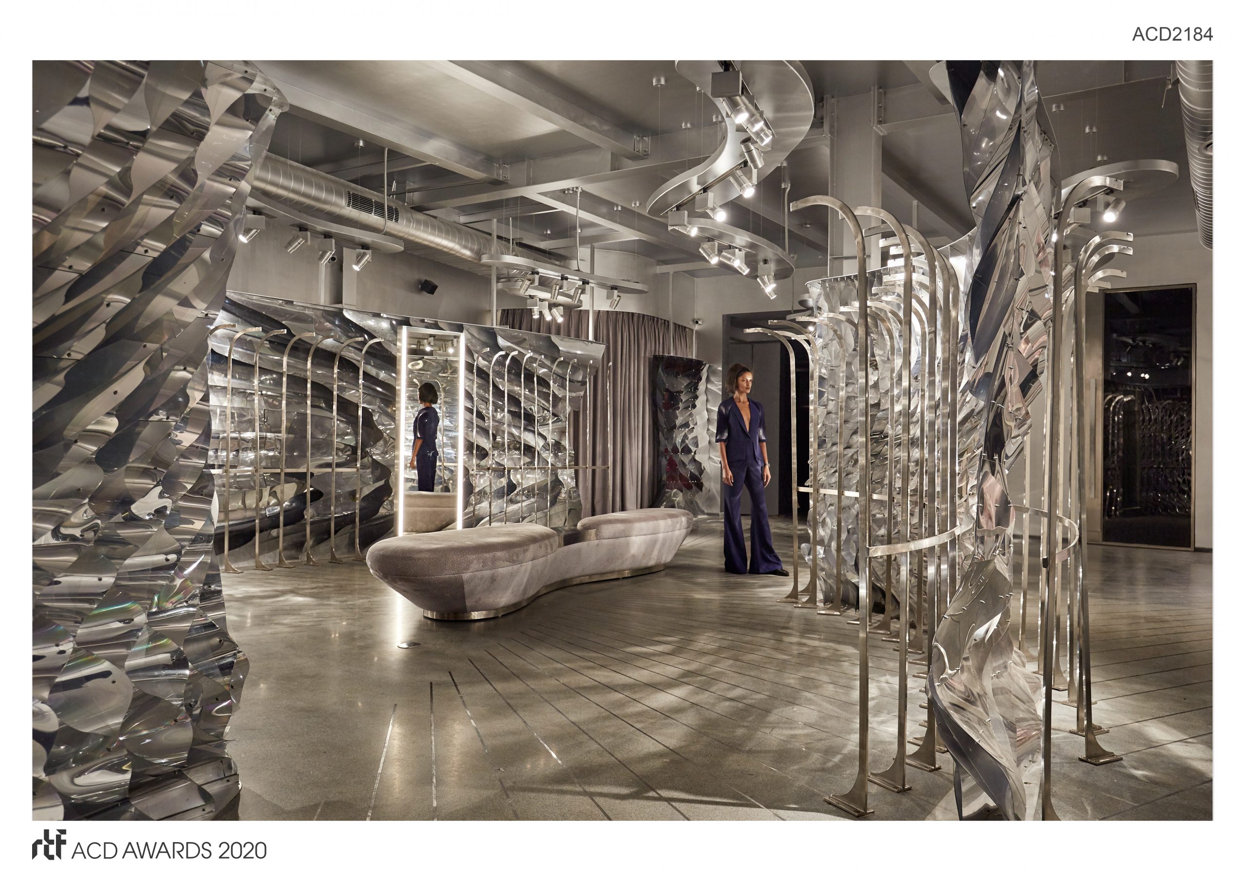 Based on the programmatic requirements within the store, the flowing spatial divisions are positioned to separate different areas across the space. These walls are designed as architectural-scale waving fabrics out of reflective sheet material that is hung from the ceiling. Through the different curvature and spacing of the panels they create shimmering light reflections and varying opacities and transparencies depending on the point of view.