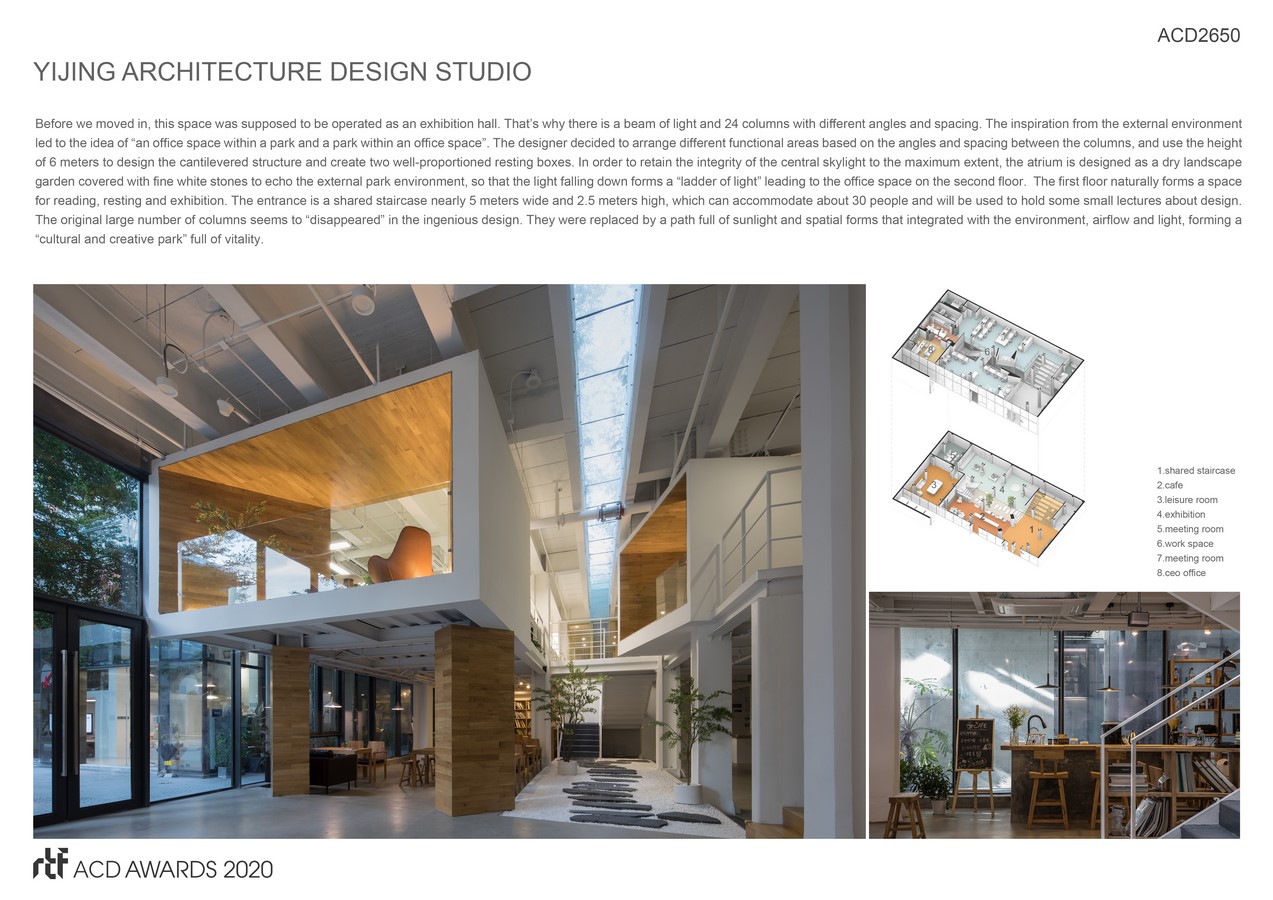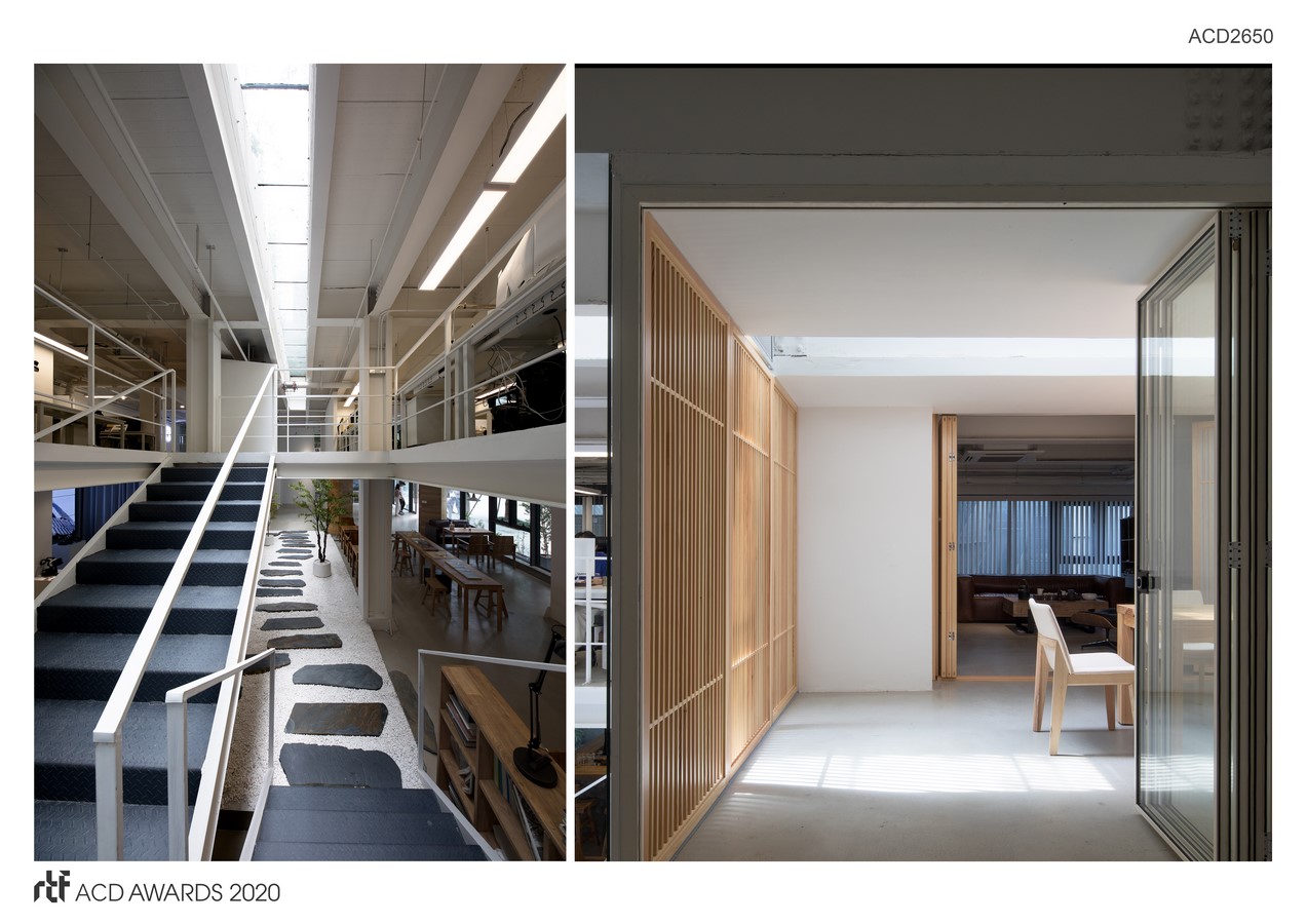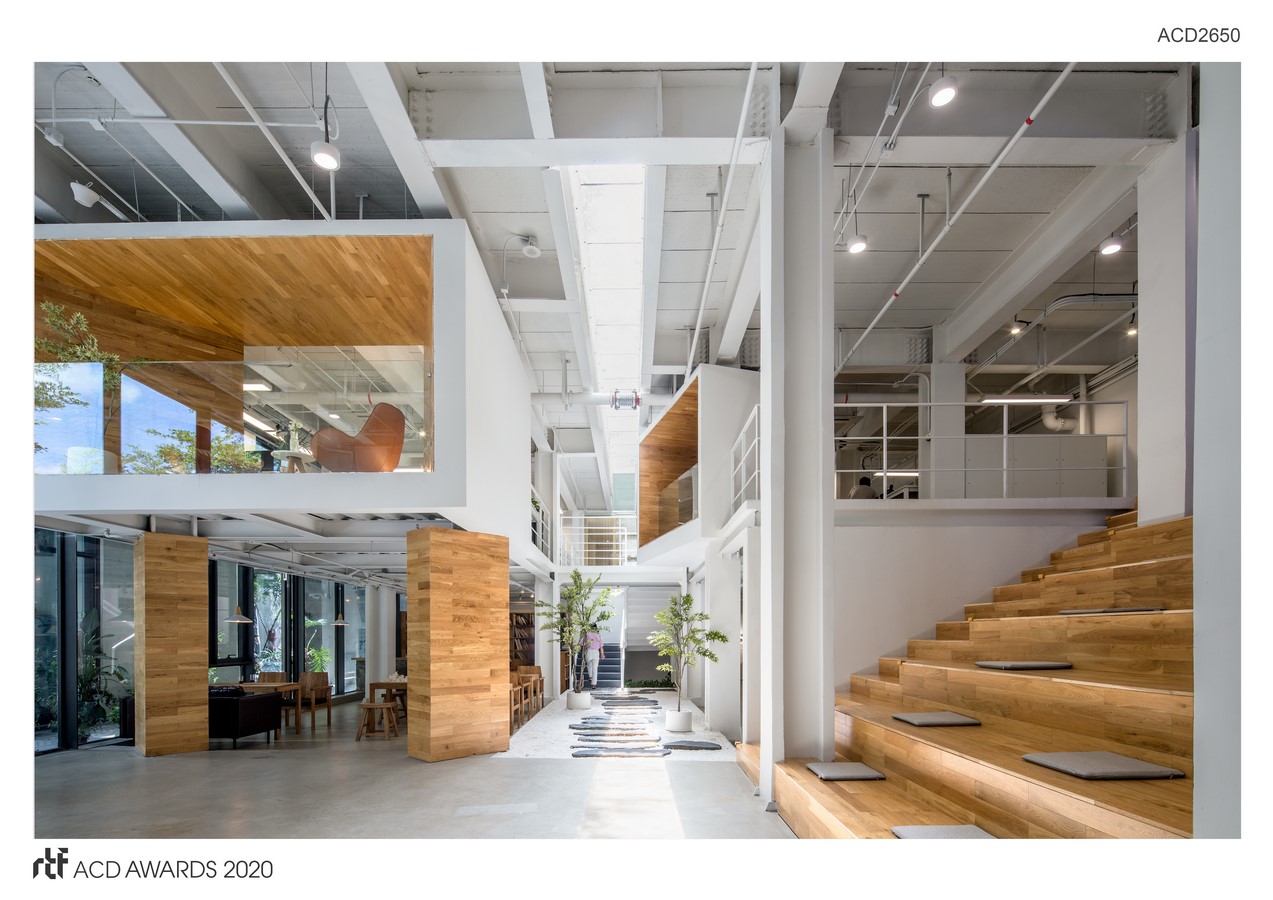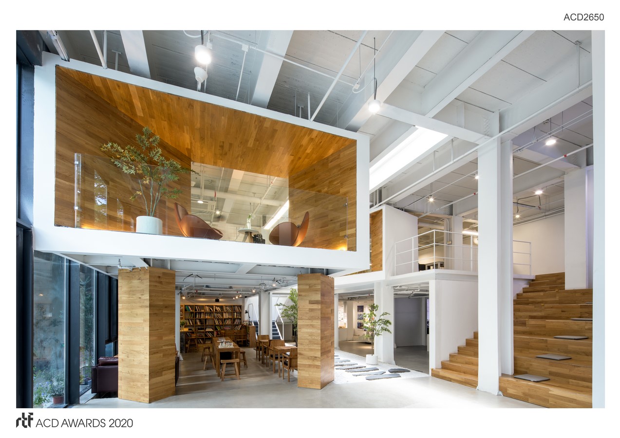 When darkness falls slowly, the whole interior space becomes purer and transparent. Architects walk down the stairs to switch from work mode to life. They eat at the cafe, play with cats or read books to relieve the fatigue of a day’s work.