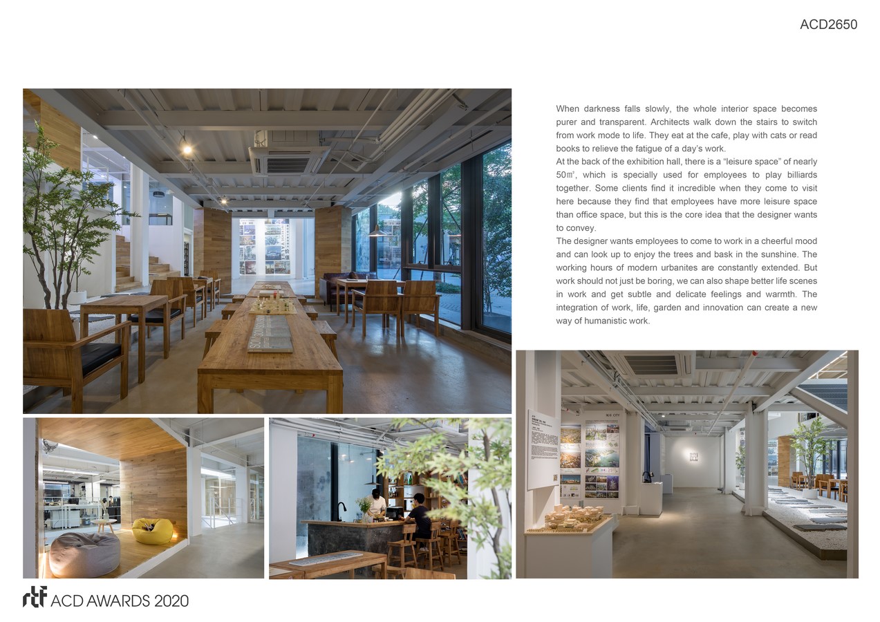 The designer wants employees to come to work in a cheerful mood and can look up to enjoy the trees and bask in the sunshine. The working hours of modern urbanites are constantly extended. But work should not just be boring, we can also shape better life scenes in work and get subtle and delicate feelings and warmth. The integration of work, life, garden and innovation can create a new way of humanistic work.