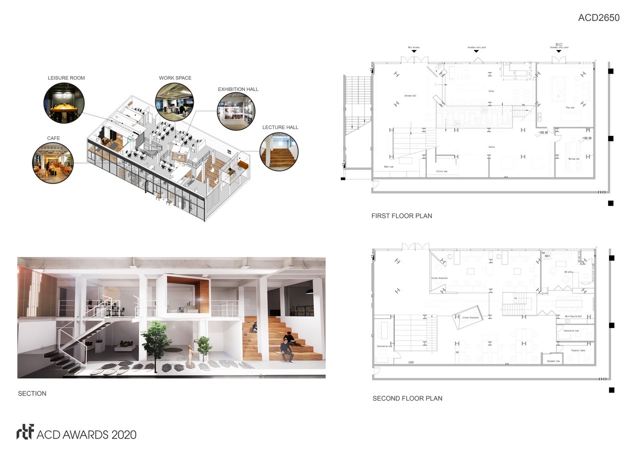 In order to retain the integrity of the central skylight to the maximum extent, the atrium is designed as a dry landscape garden covered with fine white stones to echo the external park environment, so that the light falling down forms a “ladder of light” leading to the office space on the second floor. The first floor naturally forms a space for reading, resting and exhibition. The entrance is a shared staircase nearly 5 meters wide and 2.5 meters high, which can accommodate about 30 people and will be used to hold some small lectures about design. The original large number of columns seems to “disappeared” in the ingenious design. They were replaced by a path full of sunlight and spatial forms that integrated with the environment, airflow and light, forming a “cultural and creative park” full of vitality.