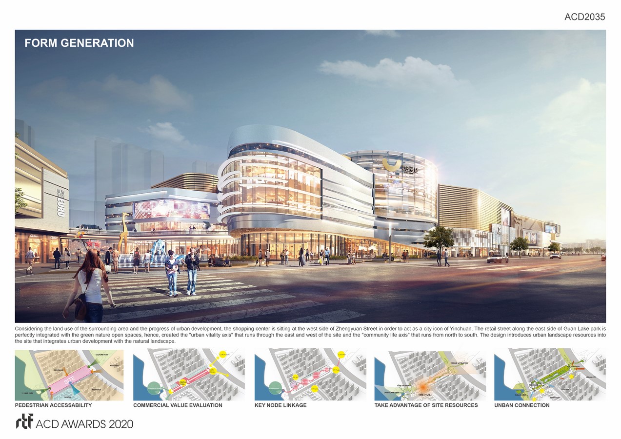 Considering the land use of the surrounding area and the progress of urban development, the shopping center is sitting at the west side of Zhengyuan Street in order to act as a city icon of Yinchuan. The retail street along the east side of Guan Lake park is perfectly integrated with the green nature open spaces, hence, created the “urban vitality axis” that runs through the east and west of the site and the “community life axis” that runs from north to south. The design introduces urban landscape resources into the site that integrates urban development with the natural landscape. The design concept of “urban symbiosis” aims to offer the city more sustainable and natural spaces for leisure and entertainment, so that people can come to enjoy, play around and relax.