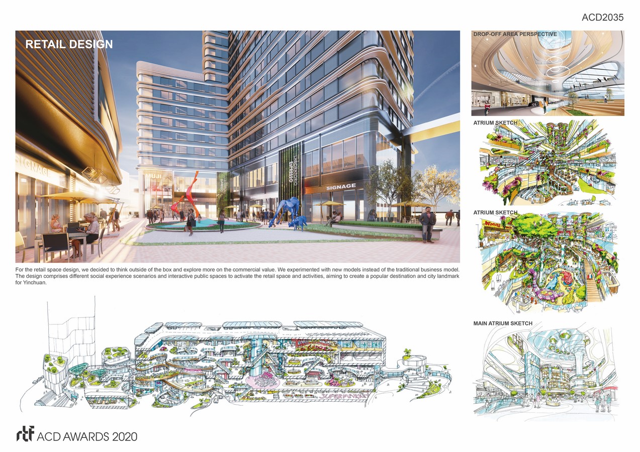 For the retail space design, we decided to think outside of the box and explore more on the commercial value. We experimented with new models instead of the traditional business model. The design comprises different social experience scenarios and interactive public spaces to activate the retail space and activities, aiming to create a popular destination and city landmark for Yinchuan.