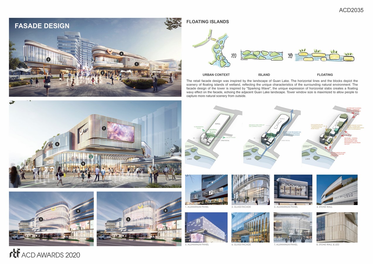 The retail facade design was inspired by the landscape of Guan Lake. The horizontal lines and the blocks depict the scenery of floating islands of wetland, reflecting the unique characteristics of the surrounding natural environment. The facade design of the tower is inspired by “Sparking Wave”, the unique expression of horizontal slabs creates a floating wavy effect on the facade, echoing the adjacent Guan Lake landscape. Tower window size is maximized to allow people to capture more natural scenery from outside.