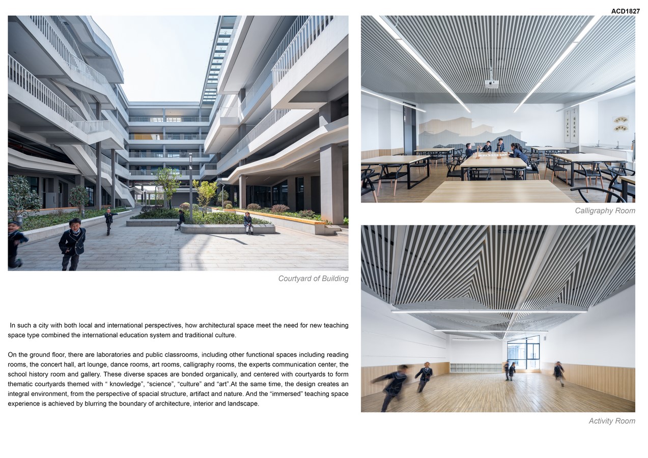 On the ground floor, there are laboratories and public classrooms, including other functional spaces including reading rooms, the concert hall, art lounge, dance rooms, art rooms, calligraphy rooms, the experts communication center, the school history room and gallery.