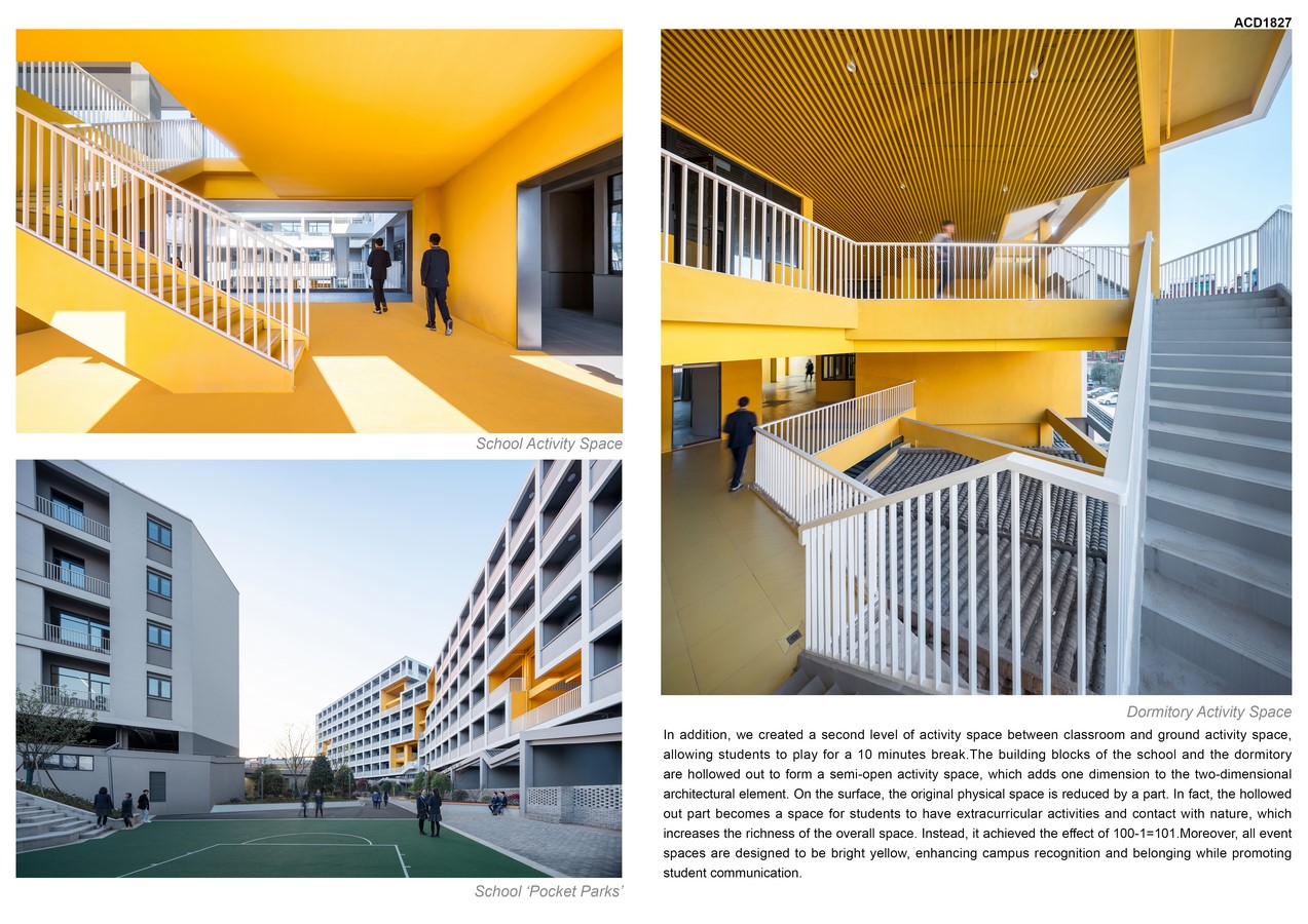 we created a second level of activity space between classroom and ground activity space, allowing students to play for a 10 minutes break.The building blocks of the school and the dormitory are hollowed out to form a semi-open activity space, which adds one dimension to the two-dimensional architectural element. On the surface, the original physical space is reduced by a part.