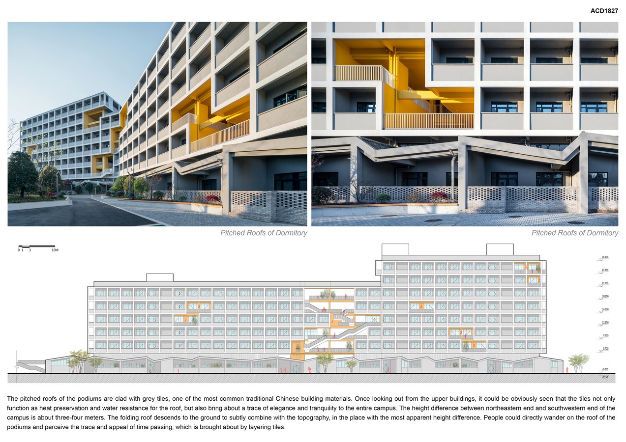 The pitched roofs of the podiums are clad with grey tiles, one of the most common traditional Chinese building materials. Once looking out from the upper buildings, it could be obviously seen that the tiles not only function as heat preservation and water resistance for the roof, but also bring about a trace of elegance and tranquility to the entire campus.
