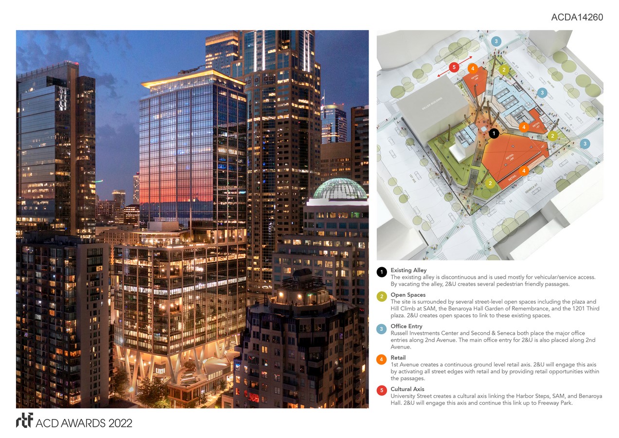 2+U creates a space for the community in the heart of downtown Seattle. Located next to the Seattle Art Museum, the project knits together the Waterfront, Business District, and Arts District by lifting the tower 85 feet above the street, providing connectivity at the pedestrian scale, and views through the block to Elliott Bay.