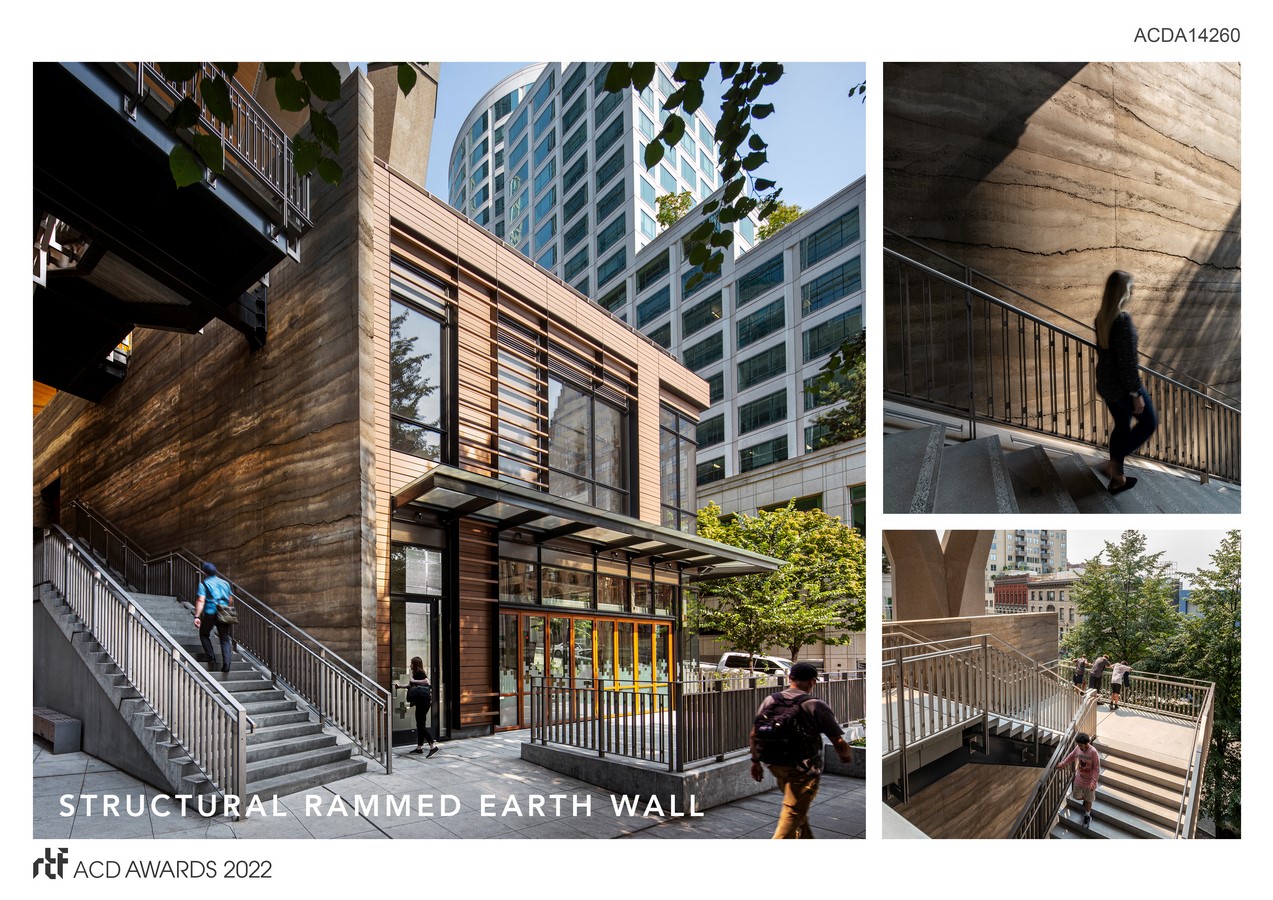 Spanning the entire three-level Urban Village, a GeoWall is the first in Seattle and one of the largest of its kind in the world. Made from local soils, the more than 220-foot long structural rammed earth wall curves through the Urban Village, starting at two feet in height and ending at more than 30 feet.