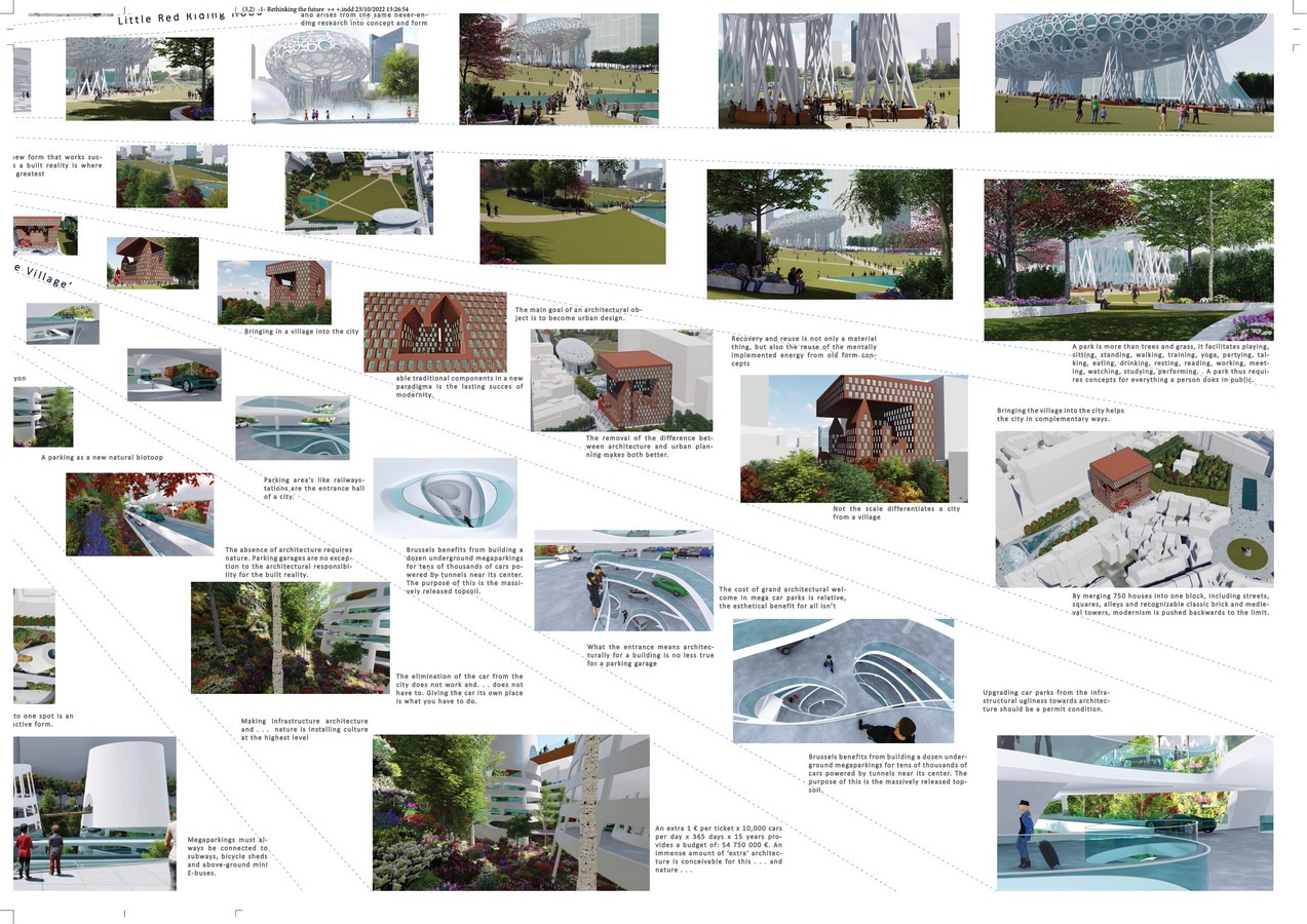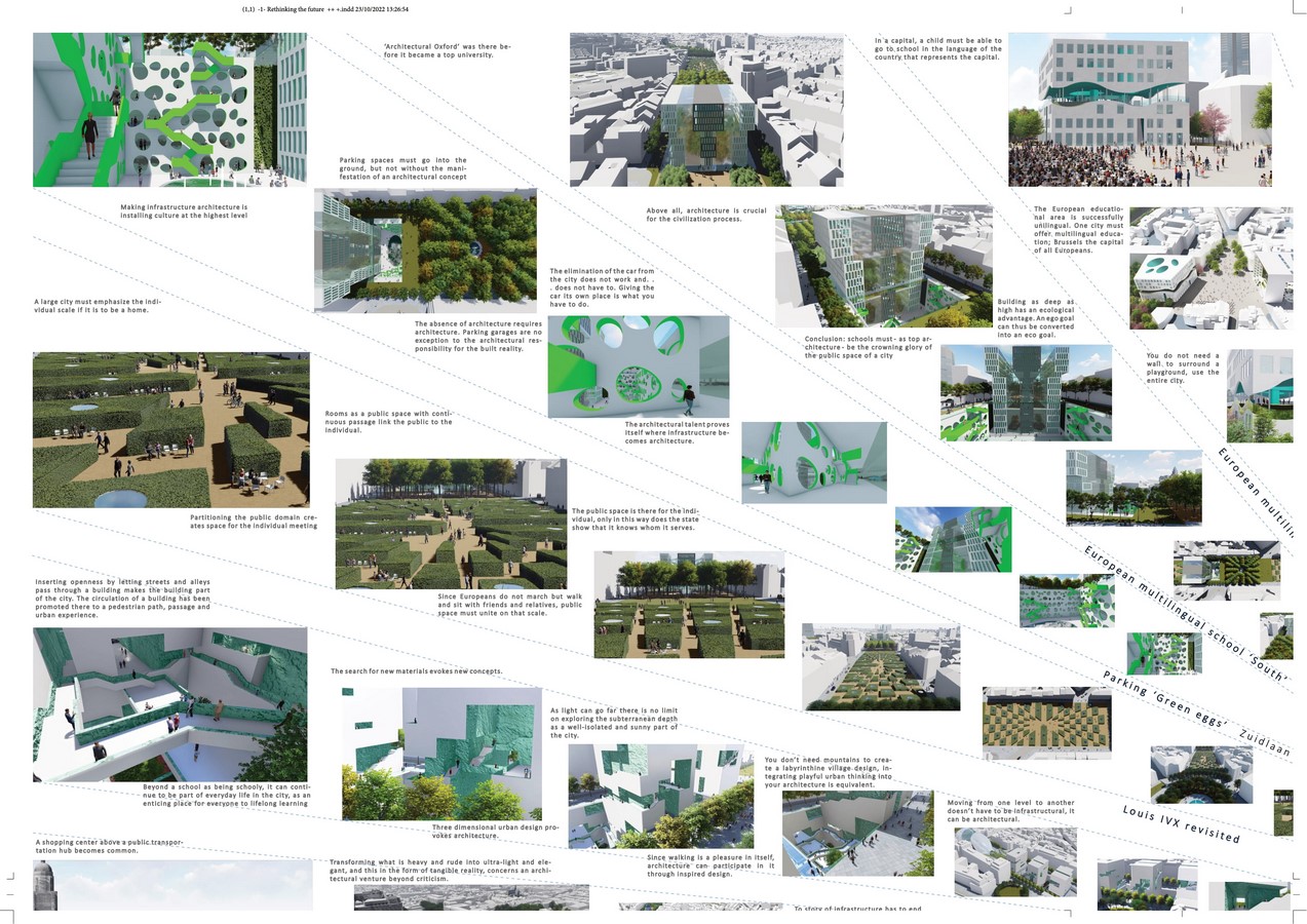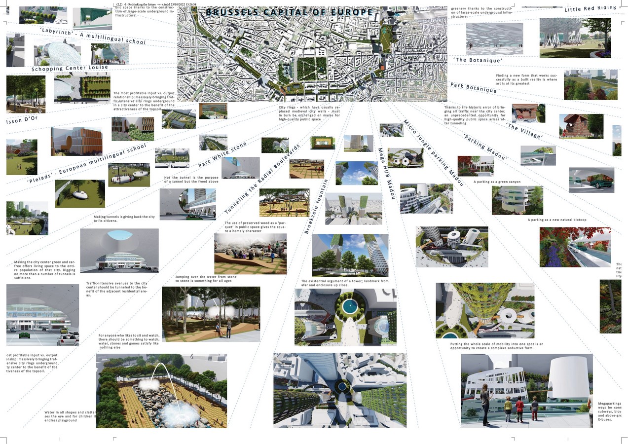 We use the newly obtained topsoil to optimize the public domain and to realize Brussels as the capital of Europe. A green ring with many attractive public spaces aims to provide European urban exemplary design *(10, 11, 12, 13). At the same time, some fifty public buildings are completing these new public spaces. Each of these buildings supports a distinctly European non-administrative function *( 14, 15, 16). Just under half of the buildings are school buildings *( 17, 18) where young people can go to school in their own national language and other European languages. The other buildings are cultural institutions that support the European identity and thus shape Brussels as the capital of all Europeans.