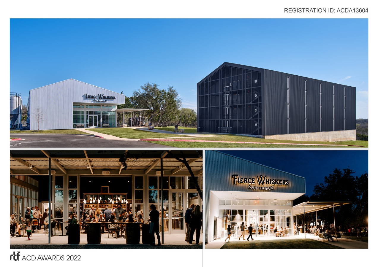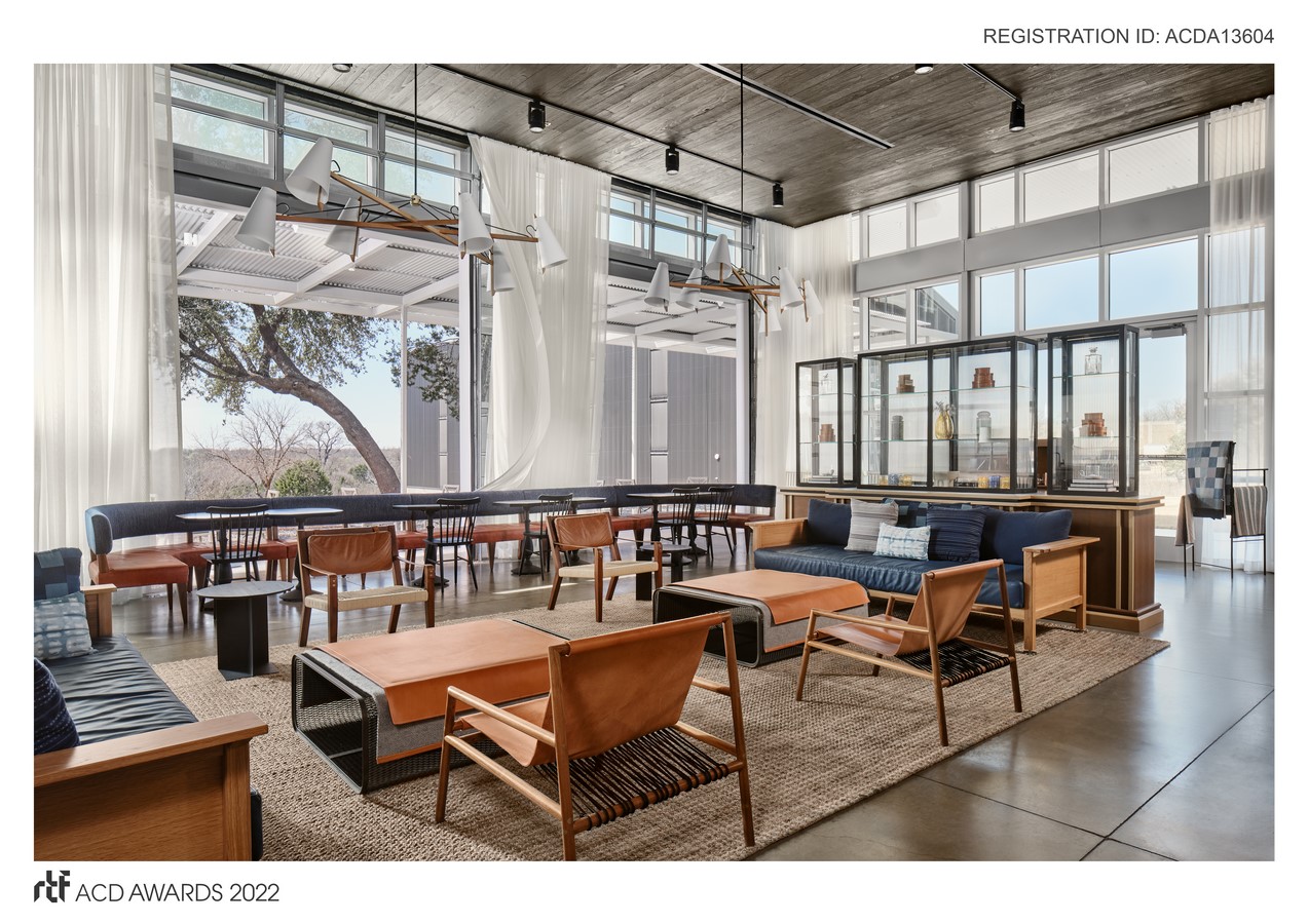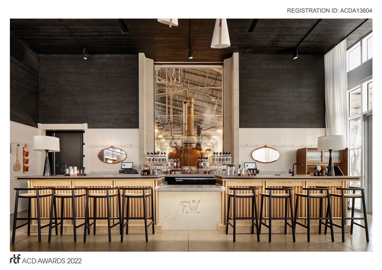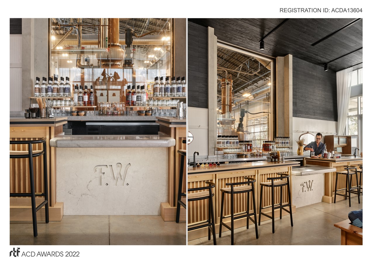 Finding inspiration in the humble vernacular of Rickhouse Functionalism, we maintained the existing shou-sugi ban wood that clads the ceiling and walls, promoting connectivity to the adjacent Rickhouse. We turned to the American artistry of the Modern Craft Movement to soften the space and add contrast, introducing local textures and patinated upholstery. The furniture reflects the artisan community of Austin, and at the same time was selected for its mobility. At the forefront of the brand’s mission is a desire to build community around the appreciation of process and responsible production, so this – combined with hosting a spectrum of events for Austin’s bustling tech scene – meant that the tasting room had to accommodate a range of programming by keeping flexibility in mind.