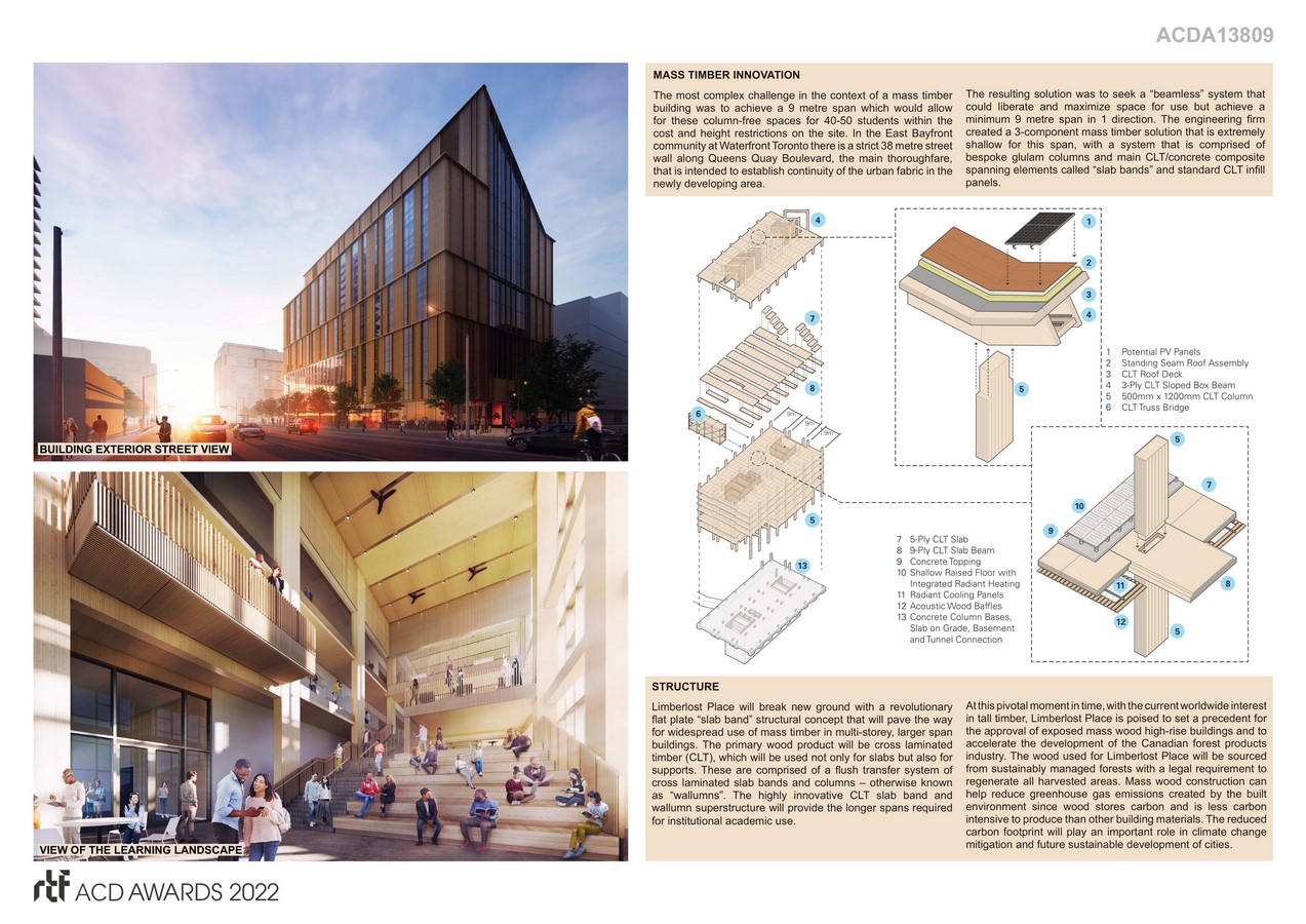Limberlost Place is the first building of this type to be constructed in Ontario, in Canada, and perhaps the world. The approvals process for this one-of-a-kind endeavour was complicated by constructing on the prominent East Bayside Community in Toronto. The architectural team utilized fly-throughs, 3-D models, and numerous meetings with the Jurisdiction Authorities. A positive outcome of this high-level of engagement on the process was the research and academic papers that have arisen henceforth, contributing to long-term research and understanding of mass timber systems.