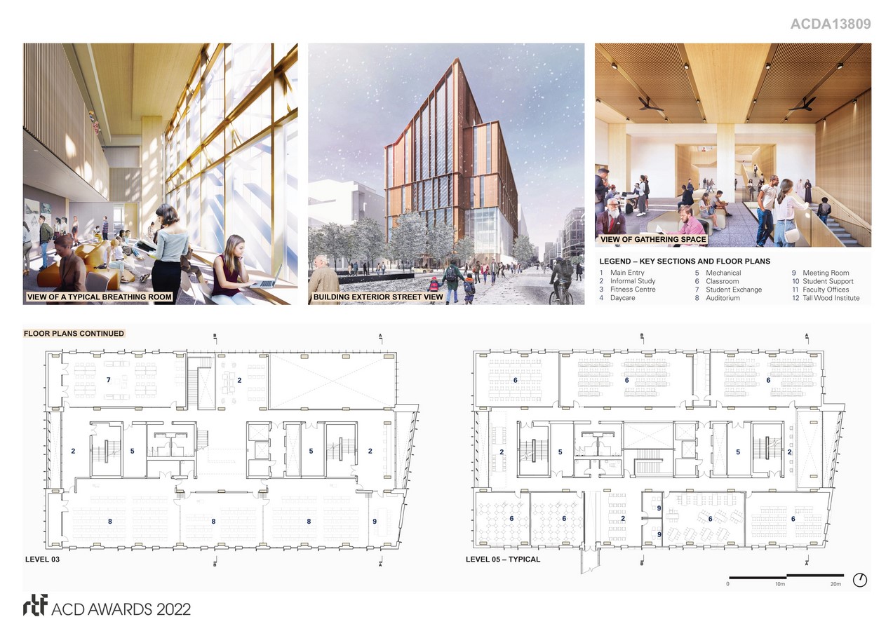As the first institutional tall wood building in Canada, the design provides generous spaces focused on wellbeing and sustainability. The building form and façade will be shaped to maximize access to natural light and fresh air. Two solar chimneys located on the east and west facades will be used to create a sustainable system of natural convection, drawing air up and through the building from operable windows. A Lean Design Process aided the development of the assembly sequence for the floor, roof, and envelope elements. This has allowed for consistent specialist input based on a standardized project model and workflow, in addition to Facility Management planning, which was developed with client input.
