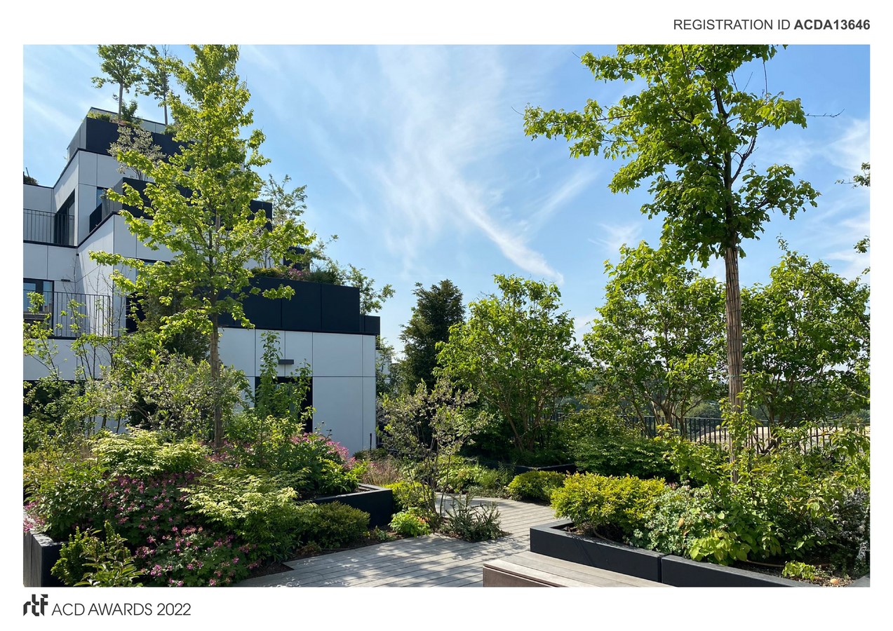 Palazzo Verde houses 86 trees, 1.000 shrubs and 1.200 plants, for a total of 780 square metres of green area consisting mainly of native species typical of the forest and sub-forest environment, selected by a team of experts and botanists. The garden roof is accessible to residents directly from the stairwells and is recognisable as a protected and inclusive space, achieved by positioning the trees and shrubs along the perimeter of the terraces.