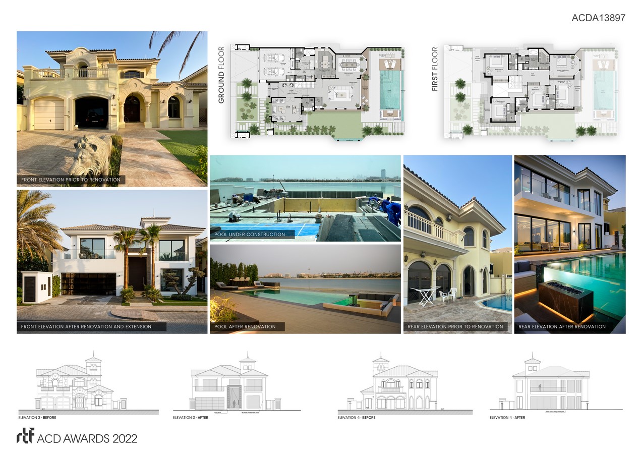 This renovation project is located on one of the most prestigious lots of the Palm Jumeirah, with views back towards the iconic downtown and marina of Dubai. The interiors are layered and sophisticated, creating a signature style that fuses with the contemporary architecture.