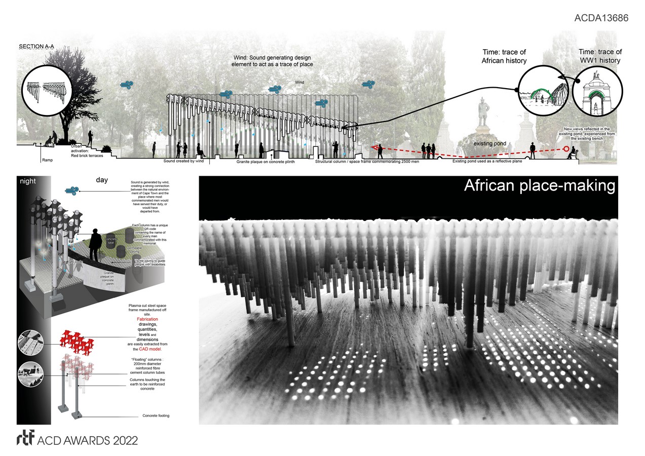 The new proposed memorial, which is the subject of this challenge, is to honor Black South Africans who lost their lives in the First World War. These are mostly service men who formed part of labor units during the war and who are believed to be buried in South Africa, elsewhere in Africa and at sea. These men have never been commemorated before in any way. Why do people leave the continent to fight a war in far off lands? It should consider the context of war, itโs memorialization then and now. Memorials often reflect political power and the social construct of the time of their commission. As these change over time, so will new memorials reflect new ideas, design thinking and/ or power relations. Therefore, space and time as two important design considerations, are key to the design challenge presented as part of the competition.ย ย ย ย ย
