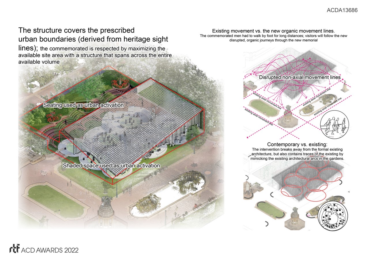 While united as memorials to those that died in service in the First World War, the two memorials (existing and proposed) differ in the social values of their time and the people they represent or memorialize. The new memorial is not a detached memorial, but a contemporary one, forming part of a larger memorial landscape, sharing a related past but distanced from each other in time and in values. There is an opportunity for the new memorial to challenge the context in which it is set and promote a more inclusive and more contextual approach to memorialization that resonates locally and internationally.