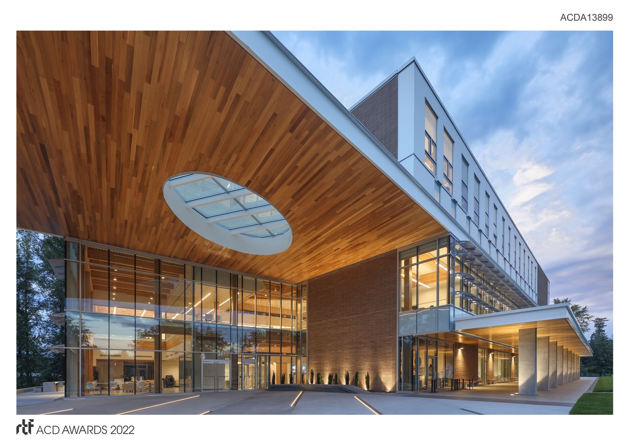 On the exterior, the use of brick cladding respects other brick buildings on campus while the choice of lighter colours updates the aesthetic. Concentrations of curtain wall create transparency and allow for connections through the campus quad to the atrium. The use of wood across the soffits brings an added sense of warmth that invites users into the space.