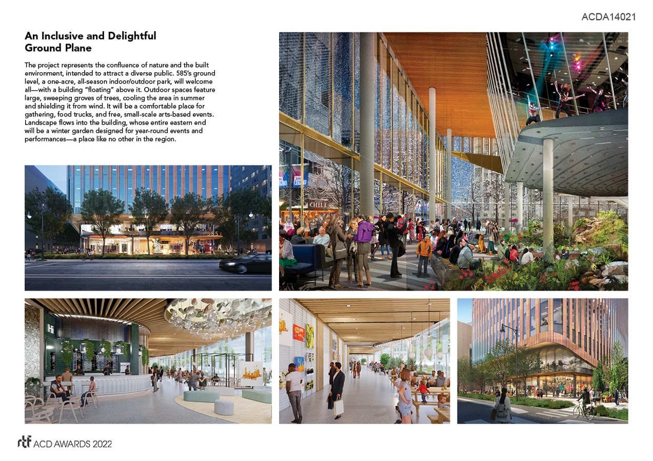A super-hybrid building where science and art converge, 585 Kendall brings nature, performance, music, community, and life sciences together in the heart of Kendall Square. The first three levels feature multiple public functions: a 380-seat theater, winter garden, retail, multi-function space, and lounges. Upper levels house 500,000 sf of lab, creating a new, community-focused design paradigm for next-gen lab buildings.