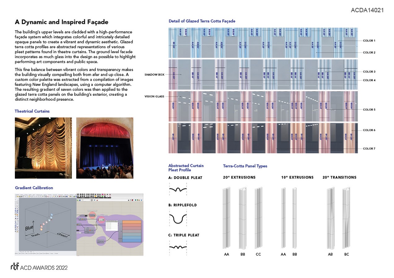 585 Kendall’s colorful, dynamic exterior is emblematic of its diverse program, inspired by the pleats in theatre curtains and colors of the regional landscape. The building’s upper levels are cladded with a high-performance unitized curtain wall system which integrates a custom color palette and intricately detailed opaque panels to create a vibrant and dynamic aesthetic. The ground level facade incorporates as much glass into the design as possible to highlight performing art components and public space. Raising the curtain-like façade at the ground-level allows for visibility across the building and encourages pedestrian movement between indoor and outdoor components, as well as connectivity to open spaces around the site that were previously isolated.