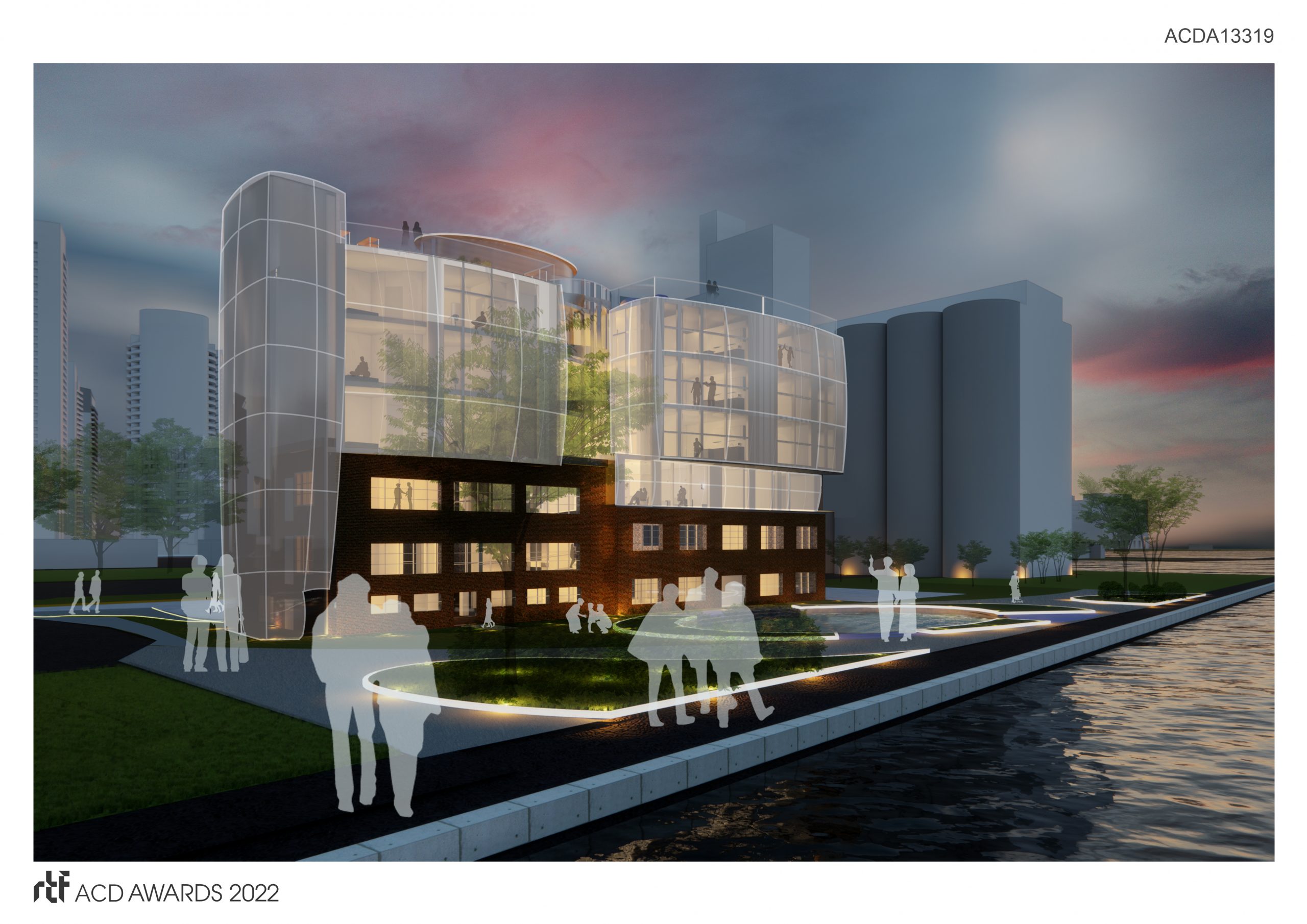 The project aims to generate a mixed-use building for Gen-Z to live and work together, offering public areas that allow visitors as audiences to experience Gen-Z’s living scenario through their own eyes. The building is going to be divided into 2 stories of co-work areas located in the existing historic brick building, and 3 stories of apartment suites in the newly designed building upon the existing structure. Asides from the major function, there are also event areas, shared kitchen/dining, and a rooftop garden throughout the building. The project will also develop on the waterside with walkways, greenery, and an ice rink that invites the public to experience.