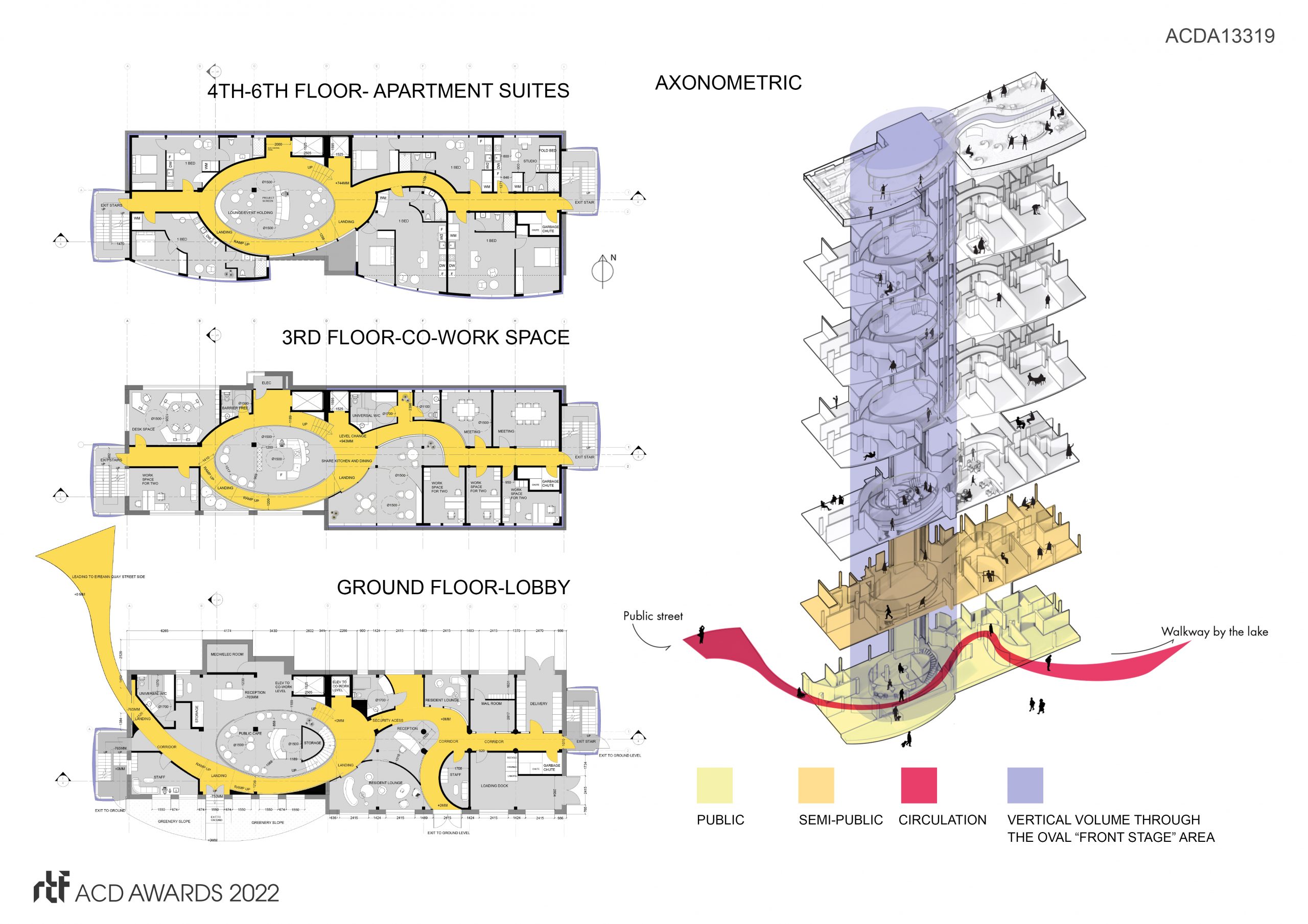 The major circulation specifically on the ground floor is showing the curve linear form inspired by the catwalk, a downward ramp leads the visitors to enter the building through the west-wide pedestrian walk of Eireann Quay. Visitors will be able to walk along the ramp to the lobby, cafe area, and able to go upstairs and use the workplaces on the second floor.