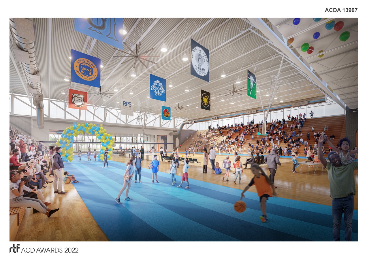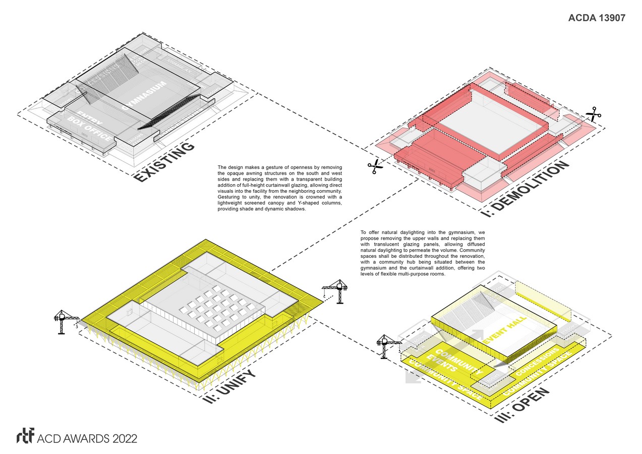 The design gestures to openness by removing the opaque awning structures on the south and west sides and replacing them with a transparent building addition of full-height curtainwall glazing, allowing direct visuals into the facility from the neighboring community. Signaling unity, the renovation is crowned with a lightweight screened canopy and Y-shaped columns, providing shade and dynamic shadows. To offer natural daylighting into the gymnasium, we propose removing the upper walls and replacing them with translucent glazing panels, allowing diffused natural daylighting to permeate the volume. Community spaces are distributed throughout the renovation, with a community hub situated between the gymnasium and the curtainwall addition, offering two levels of flexible multi-purpose rooms.