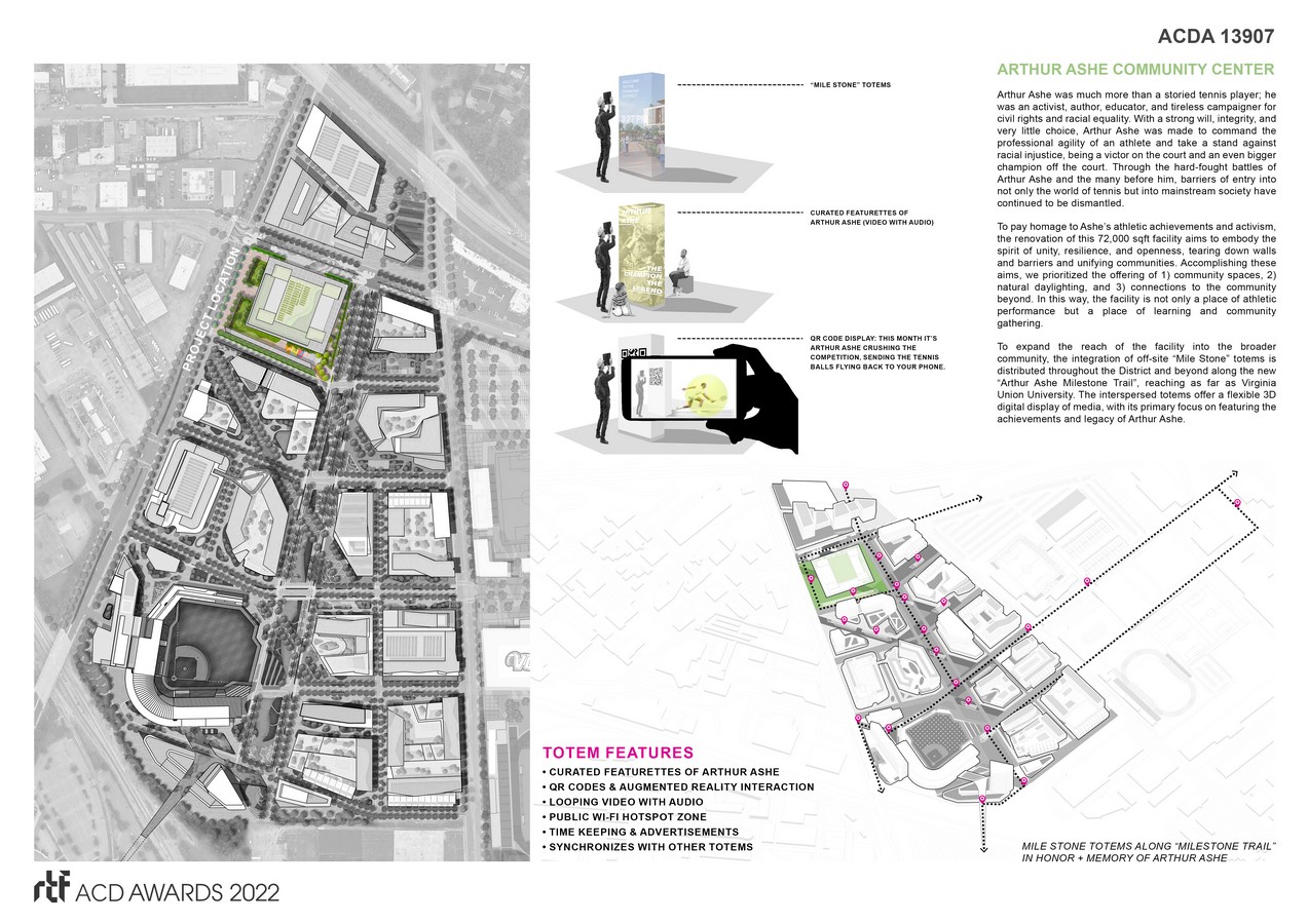 Recognizing the site’s cultural significance, it was important to extend the reach of the building into the broader community. The overarching Diamond District development allows the integration of physical and digital environments through off-site “Mile Stone” totems distributed along the new “Arthur Ashe Milestone Trail”. The trail is planned to traverse the District and reach as far as Virginia Union University creating an immersive experience well beyond the boundaries of the facility. While the primary focus of these interspersed totems is to highlight the achievements and legacy of Arthur Ashe, they also these 3D digital media displays can be highly flexible and respond to unique events.