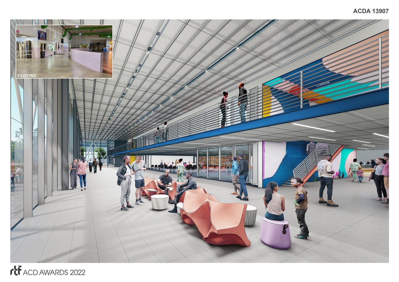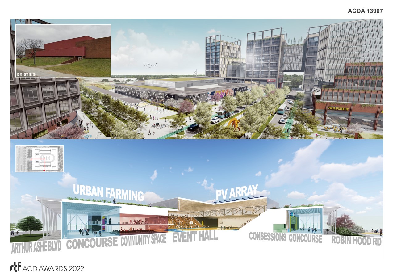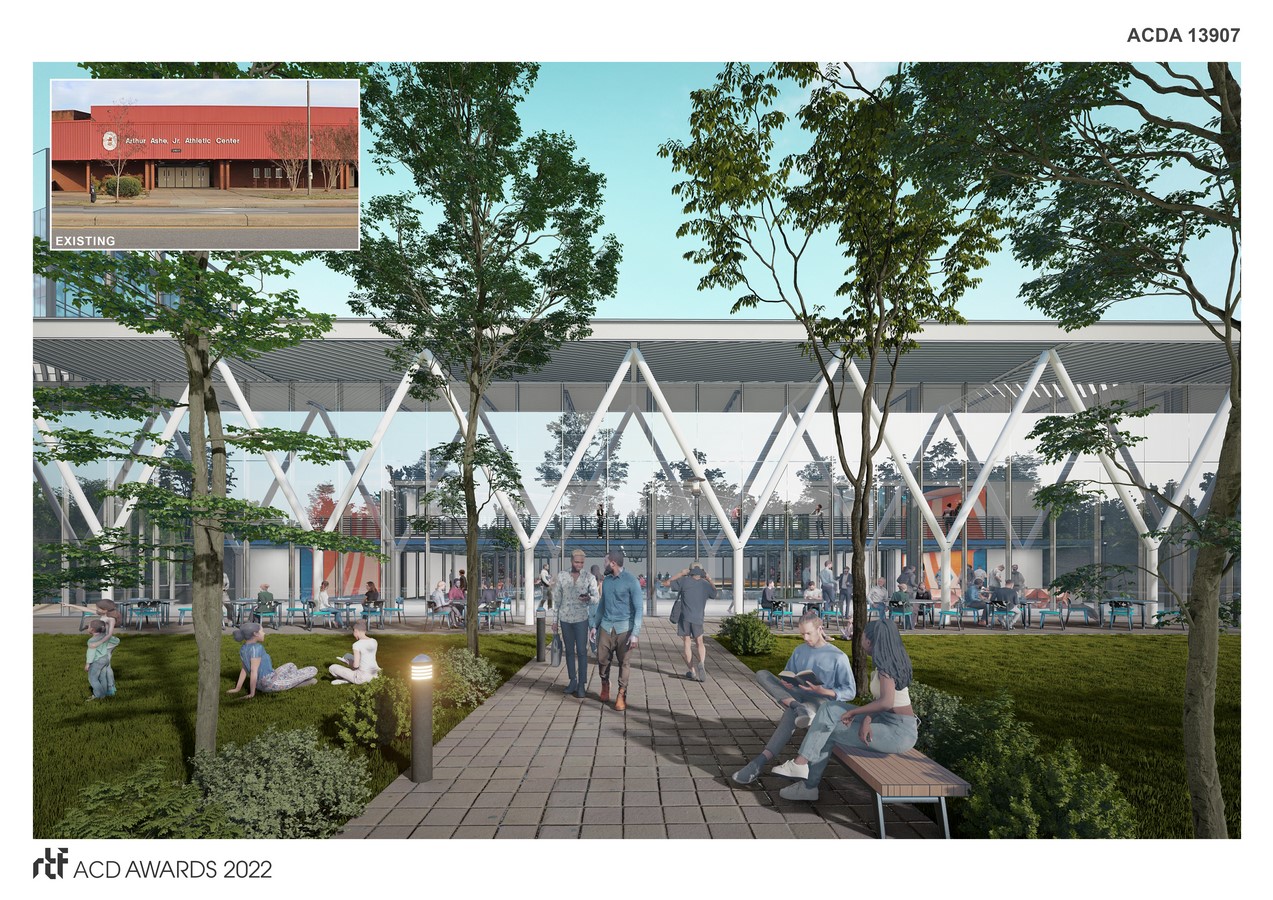 Honoring Ashe’s athletic achievements and activism, the proposed renovation of the existing facility as part of the Diamond District redevelopment initiative aims to embody the spirit of unity, resilience, and openness while tearing down literal and metaphorical barriers and unifying communities. The new program calls for a resilient “refresh” (light to moderate renovation) of both the interior and exterior while maintaining the core of the existing walls and footprint. Therefore, we prioritized the offering of 1) community spaces, 2) natural daylighting, and 3) connections to the surrounding community. The facility now becomes both a vibrant place of athletic activity and a venue for learning and gathering.