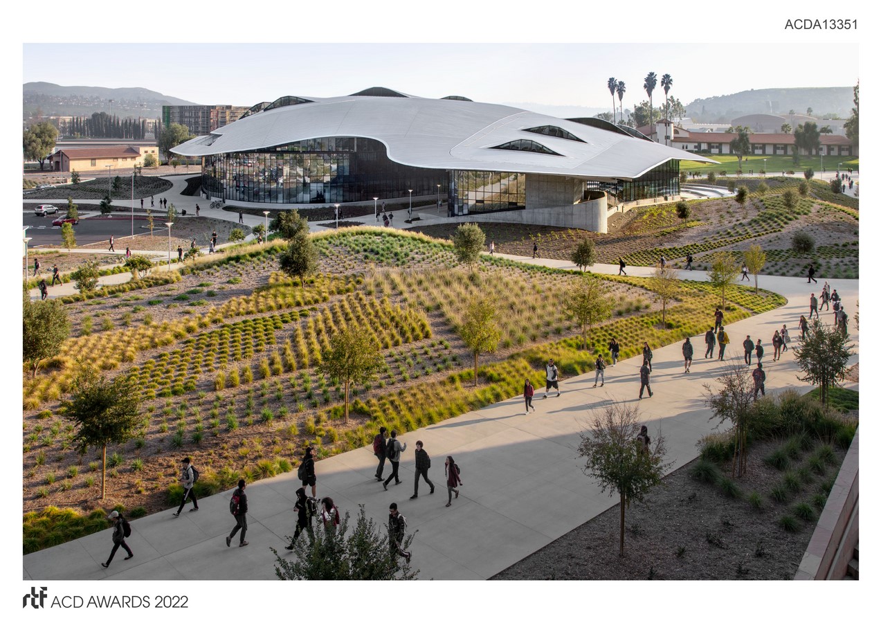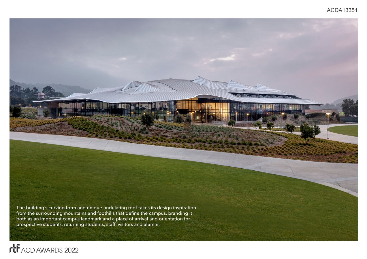 Striking in design, the Cal Poly Pomona Student Services Building marks a place of arrival and orientation for students, staff, alumni and visitors. Nestled into the landscape, the building’s large, undulating canopy makes a powerful visual statement, establishes a new landmark, and shelters three accessible floors of student services and associated administrative functions. The design draws its inspiration from the surrounding mountains and foothills that are articulated in the building’s shape and the form of its standing-seam aluminum roof, uniting it with the landscape and demonstrating a commitment to sustainable operations and practices in a dramatic way.