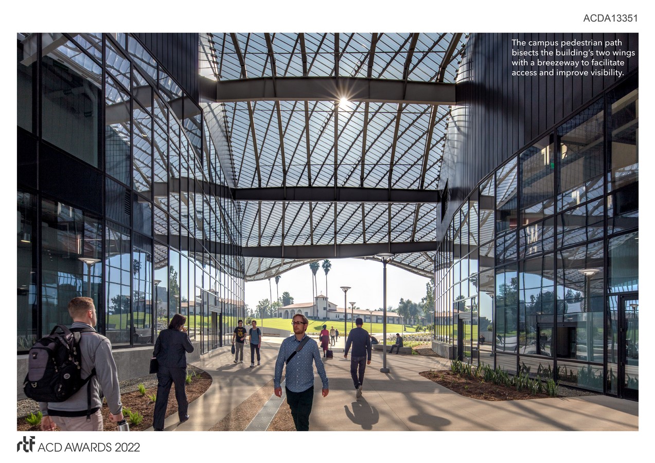 Functions of enrollment, financial aid, cashier and student success are located on the ground level. Offices for academic, student and administrative affairs are located above and feature open layouts, shared conference facilities, kitchens and break rooms to encourage collaboration across departments. The buildings are bisected by a central breezeway – or “street” – that continues a natural campus pedestrian path. The perforations in the canopy roof– combined with the deliberate shaping of the street – generate funnels that move air through the public space below, creating a pleasantly cool exterior space with ample seating for students, visitors and staff to enjoy.