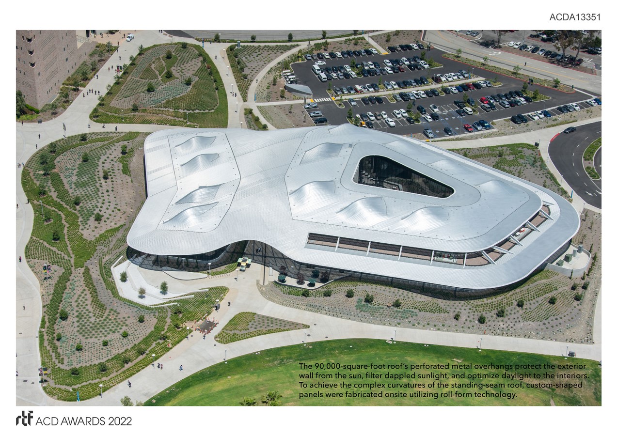 The two-acre, curved aluminum roof serves as the main passive energy-performance driver. The standing seam assembly includes perforated overhangs that shelter the vertical enclosure and act as a shading device for the glazed areas filtering sunlight, maximizing daylight and minimizing glare. It achieves a complex, compound geometry with a modular panel system, connecting the project to its context and providing complete malleability to optimize solar exposure. Uniformity and life-cycle performance of the aluminum finish enhances the visual impact and provides the university with an assembly requiring no long-term maintenance. Conceptualization, documentation and fabrication of the metal roof solely used digital tools in a paperless delivery process. Individual panel geometry data was fed directly from the model into mobile, roll-forming machines on site, pre-fabricating all standing seam panels, saving time and creating zero waste.
