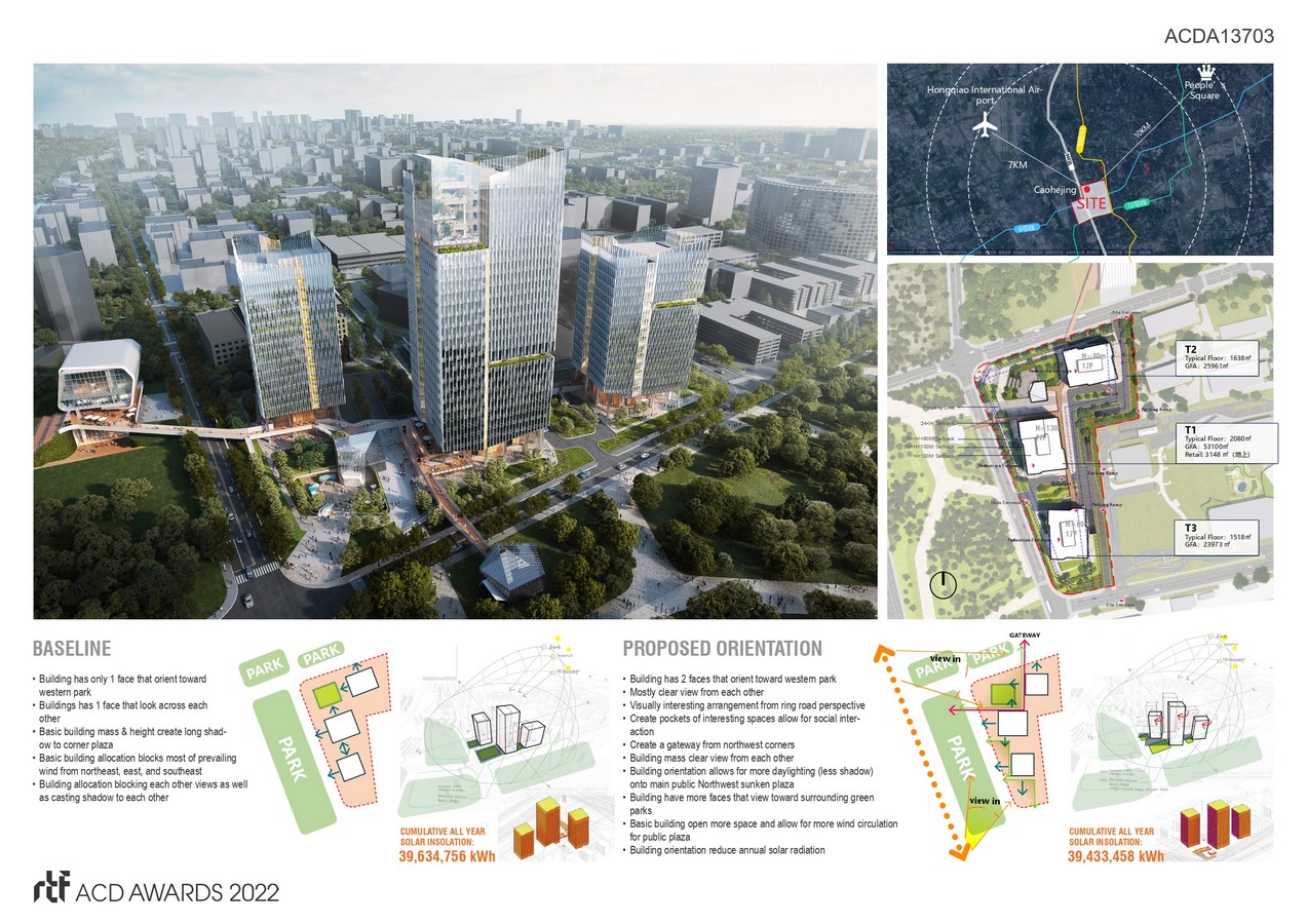 The class-A office towers is perceived as the new Northgate of larger up-and-coming high tech park development in south-western part of Shanghai City. The project visions are to become an iconic representation, a symbol of clientโs commitment to create future workplace for their employees and prospective tenants. The project goals are to build a harmony between human and nature, work-life balance, health and wellness, highly social and connected environment which allow for high performance, happiness in workplace.ย ย To set new precedents for the future buildings of the high-tech park, the design aims towards highly sustainable building, achieving net-zero.