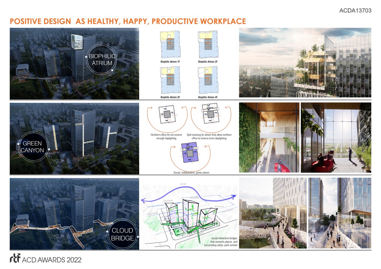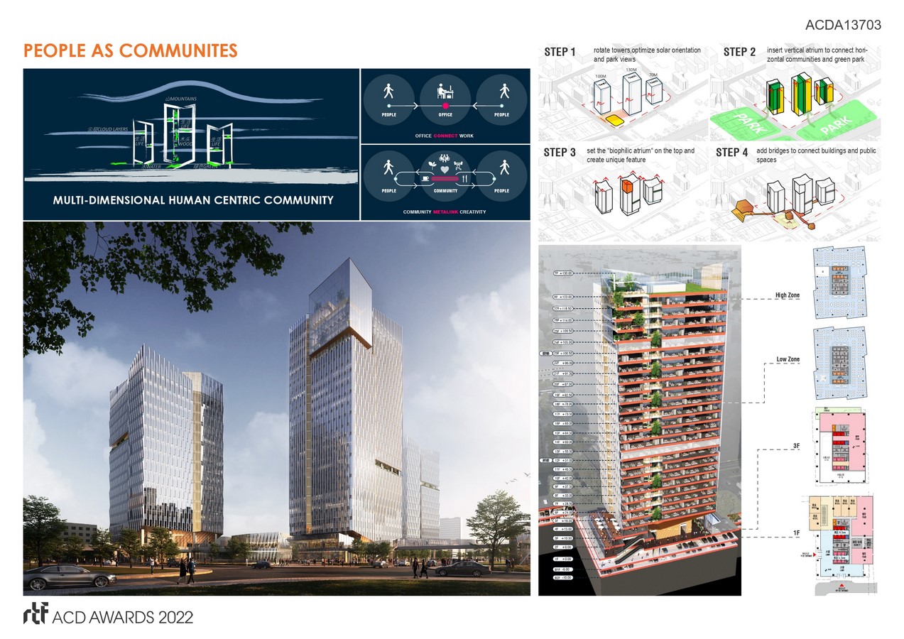 The principles of our design approach are well aligned with clientโs visions and goals, PEOPLE-PLANET-POSITIVE DESIGN.ย The PEOPLE are the communities, the PLANET is net-zero impact to the environment, and POSITIVE DESIGN is the healthy, happy workplace environment. The tower design is called Meta Linked Communities.ย Beyond achieving the program area requirement, the vertical tower is a basic stacking of horizontal volumes or peopleโs workplace, so, the challenge is how can we create the wholistic environment so that people are connected, socially engaged, being healthy, and being highly productive?ย With the Performance Driven Design approach, we carefully studied the site, climate data, programmatic relationships, energy modeling, daylighting analysis to optimize building orientation, shape, view vistas, and energy performance.