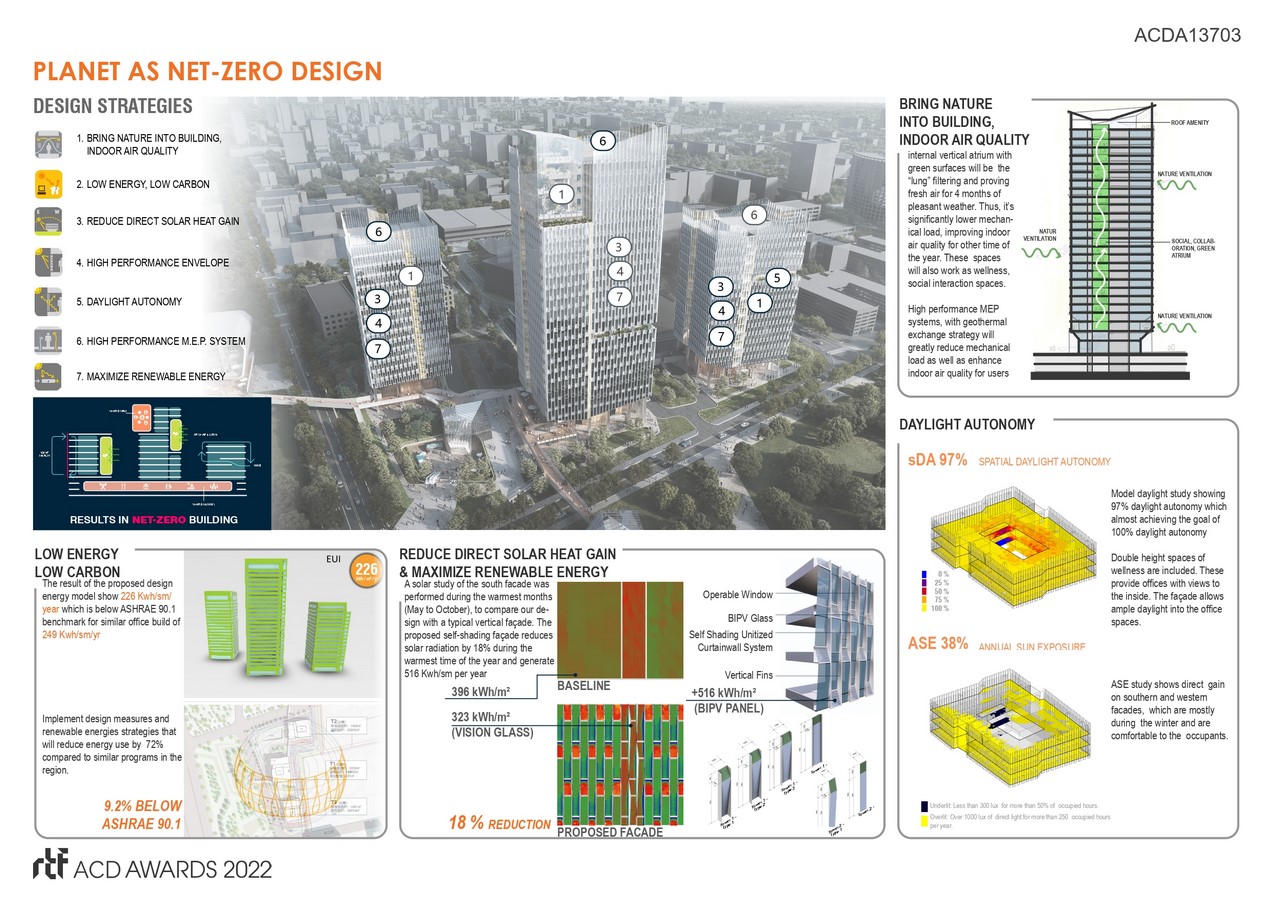 Our implemented sustainable approaches are bringing nature into building to improve indoor air quality, low energy and low carbon emissions, reduce direct solar heat gain, high performance building envelope, daylight autonomy, high performance MEP systems, maximize renewable energy. Improve indoor air quality will reduce mechanical load in more than 4 months of the year.ย Improve building orientation to reduce solar energy by 9.2 percent and using low carbon emission materials throughout.ย The building envelope uses unique shelf-shading configuration to reduce solar radiation, therefore reducing mechanical building load.ย Enhance daylighting autonomy to provide ample daylight without glare for comfortable and better work performance as well as will save electrical load. Introduce high performance mechanical VAV system with smart building control as well as geo-thermal system to further reduce building overall EUI; using lighting sensors, daylight harvesting, low plug-load, and low task lighting to reduce electrical load; using low flow fixture and rain-water management to optimize water use. To regenerate energy, building integrated photovoltaic (BIPV) is being used on the upper portion of unitized curtainwall with optimized angle to maximize energy output.ย As the result of many energy reduction strategies and high output energy regeneration, the building will achieve net-zero.