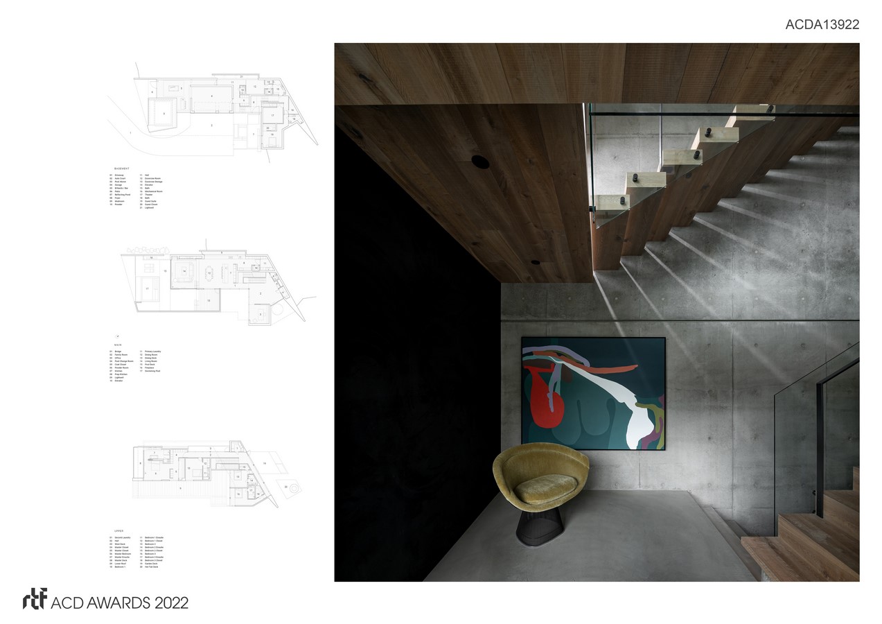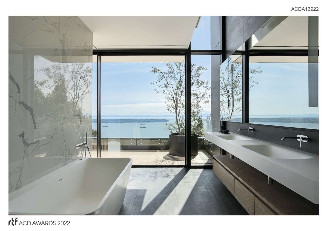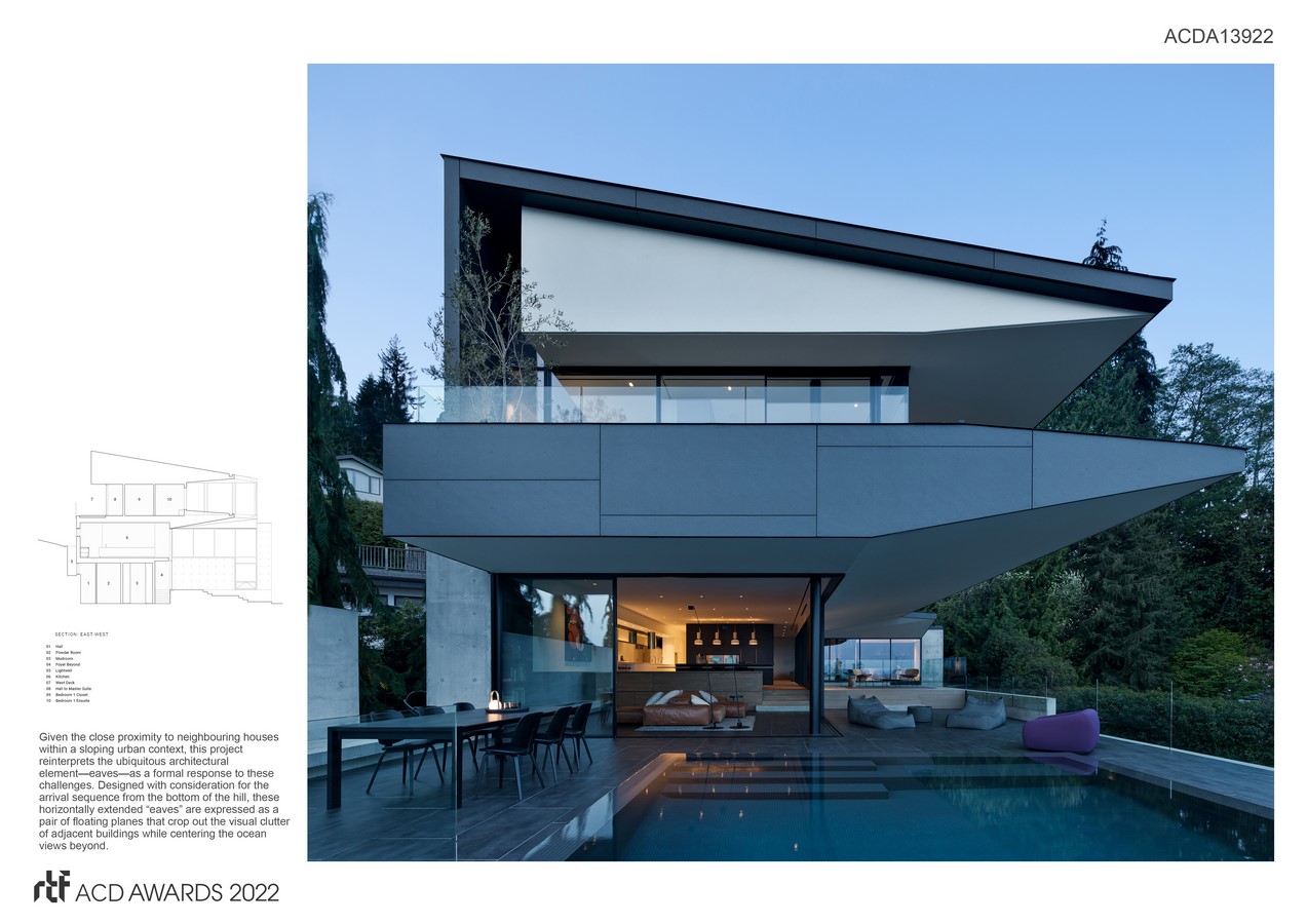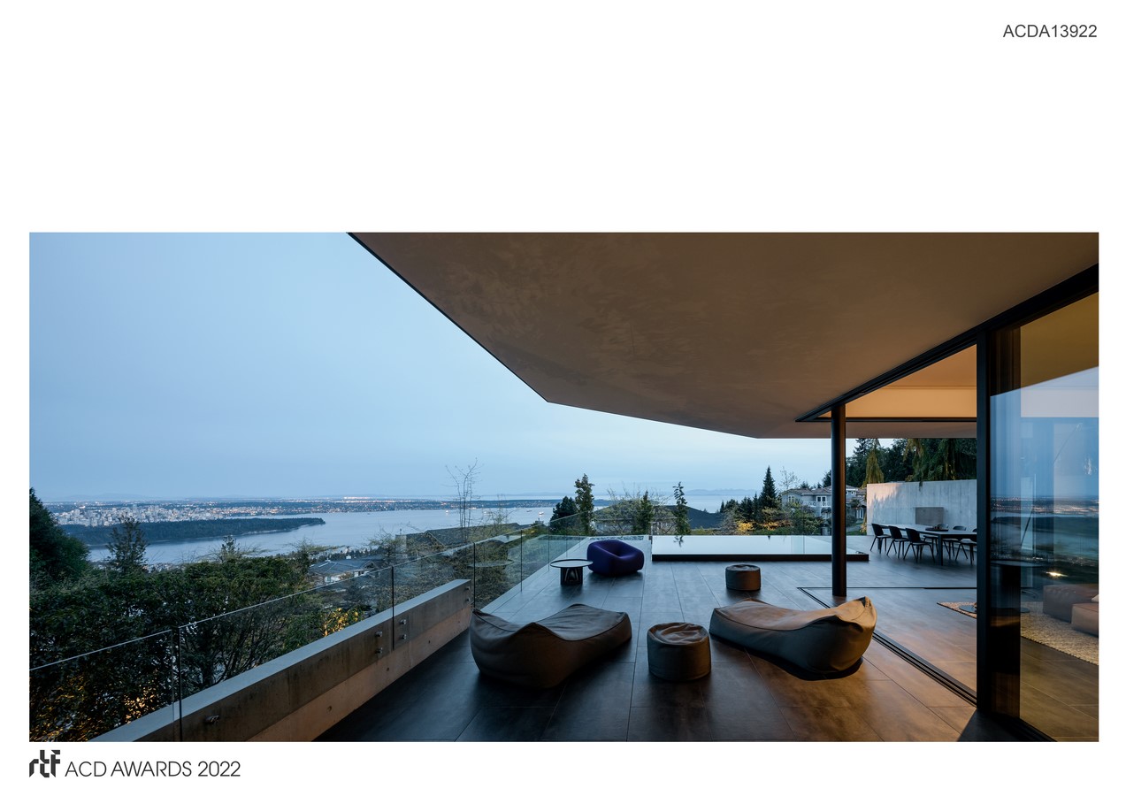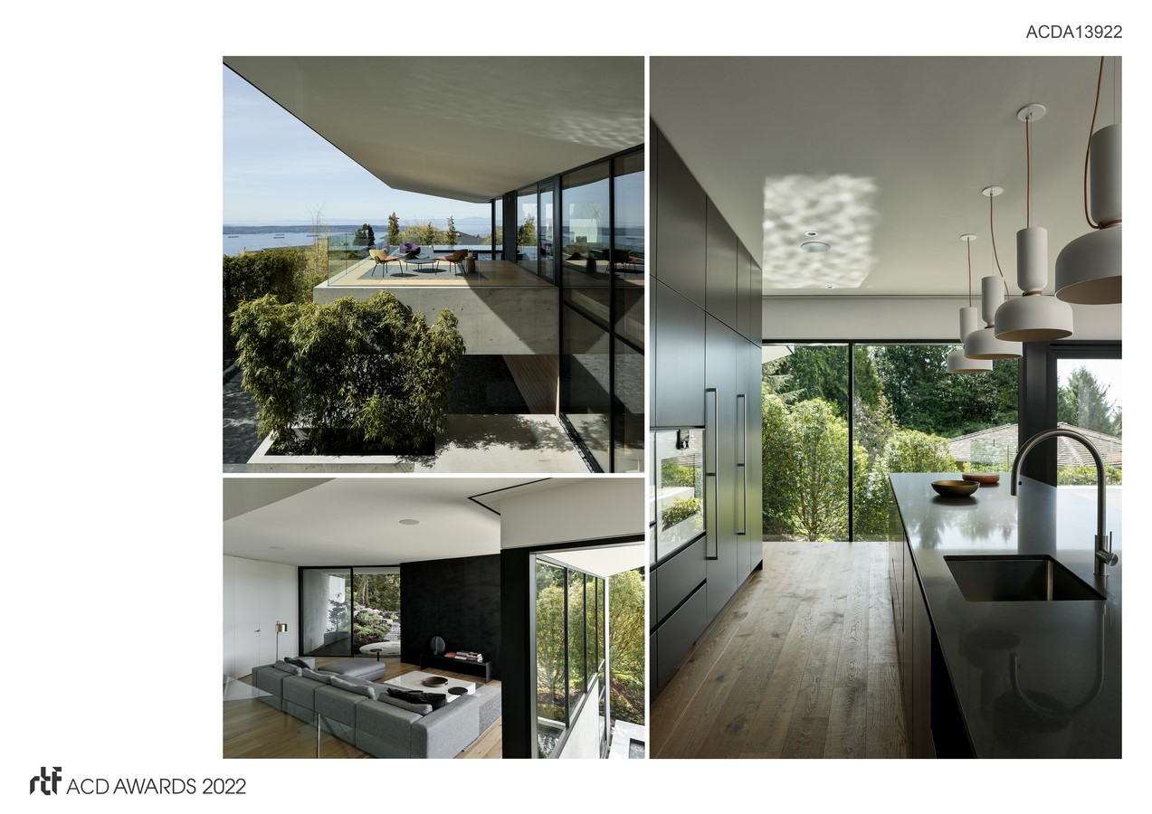 The house is formally comprised of a hovering concrete plinth at the main floor which sits underneath two broad eaves. The plinth forms a new โgroundโ in the air which obscures a large auto-court at the basement floor and creates privacy by masking the road and windows of adjacent houses below. The two extruded roof masses above similarly serve to edit out the sub-urban foreground while framing and focusing vistas toward the water.