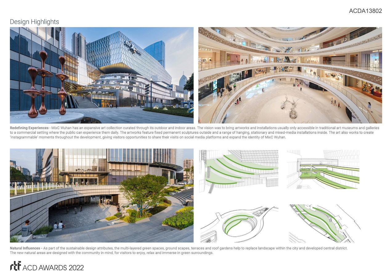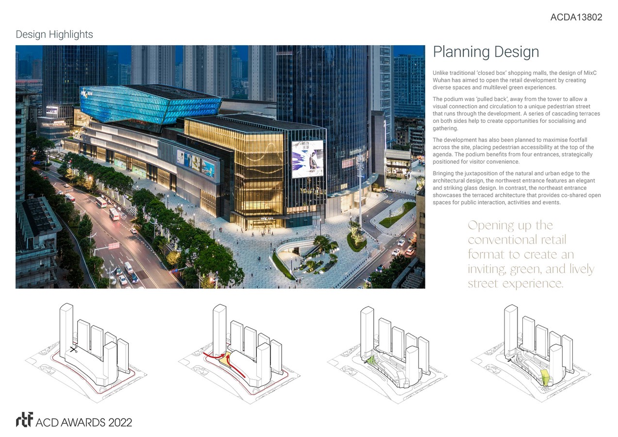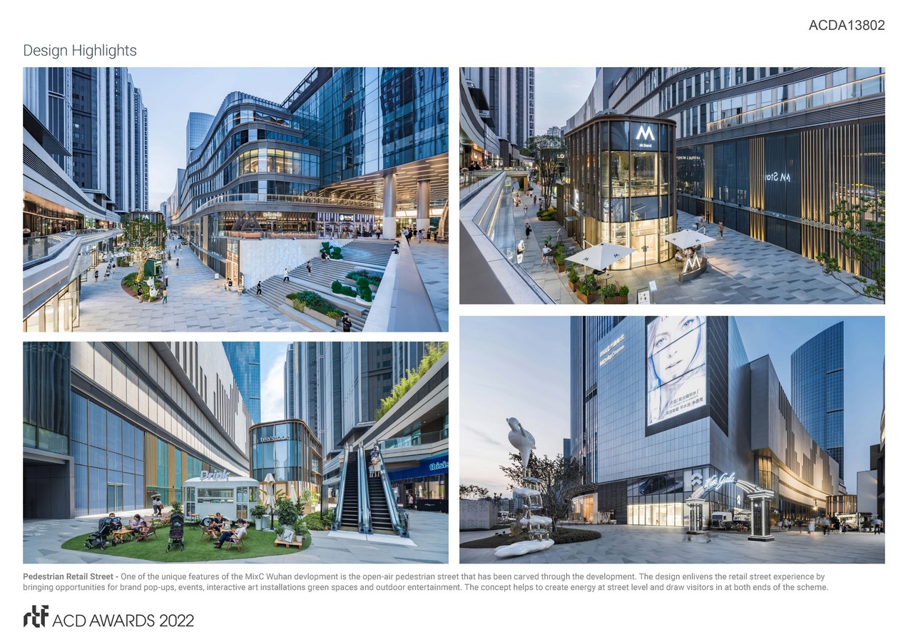Overall, MixC Wuhan serves as a new co-sharing social hub for the public to enjoy, a brand new outdoor and retail experience with accessibility to a diverse array of spaces and activities. A new jewel for the city.
