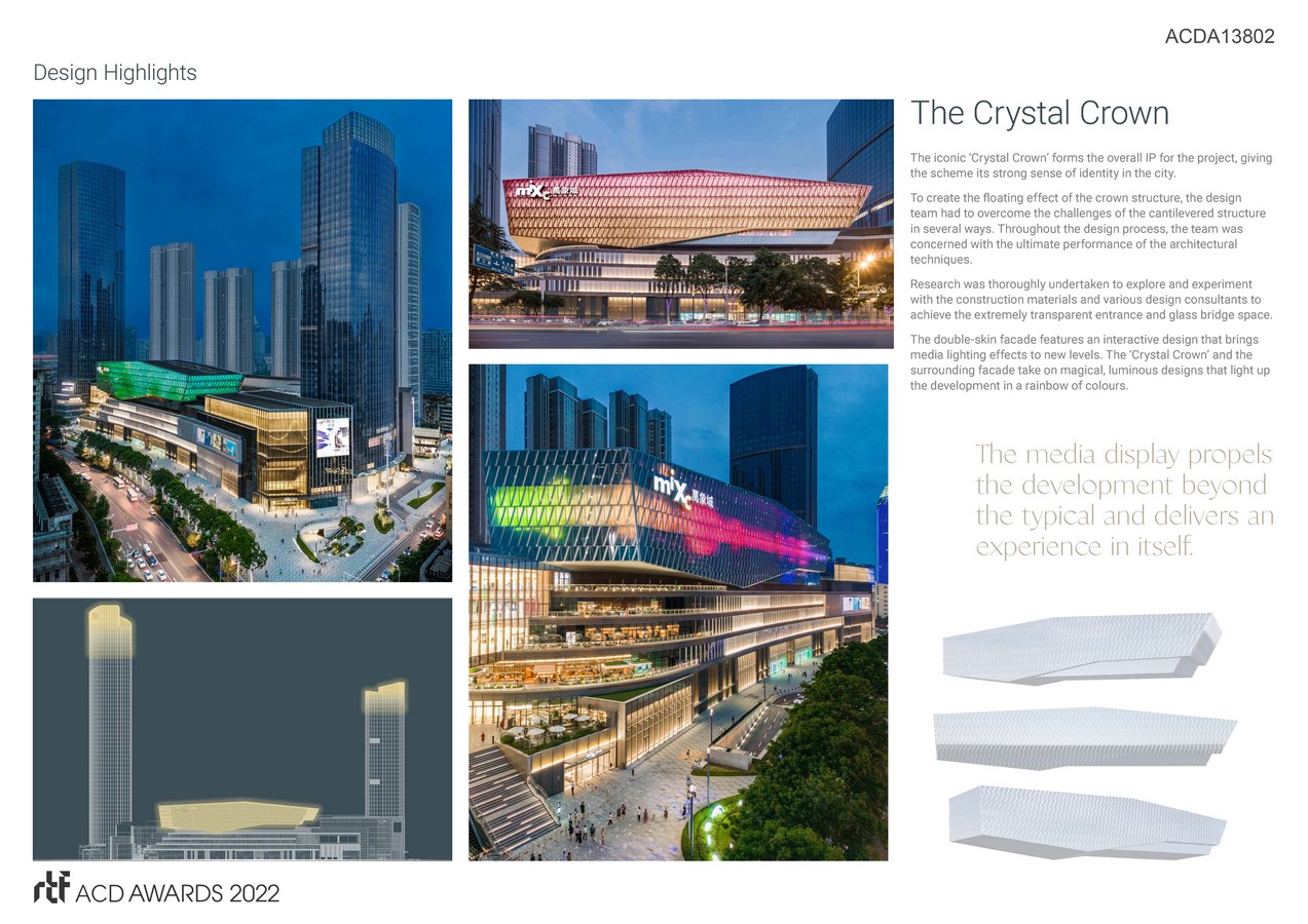 Unlike traditional ‘closed box’ shopping malls, the design of MixC Wuhan has aimed to open the retail development by creating diverse spaces and multi-level green experiences. The iconic ‘Crystal Crown’ forms the overall IP for the project, giving the scheme its strong sense of identity in the city.