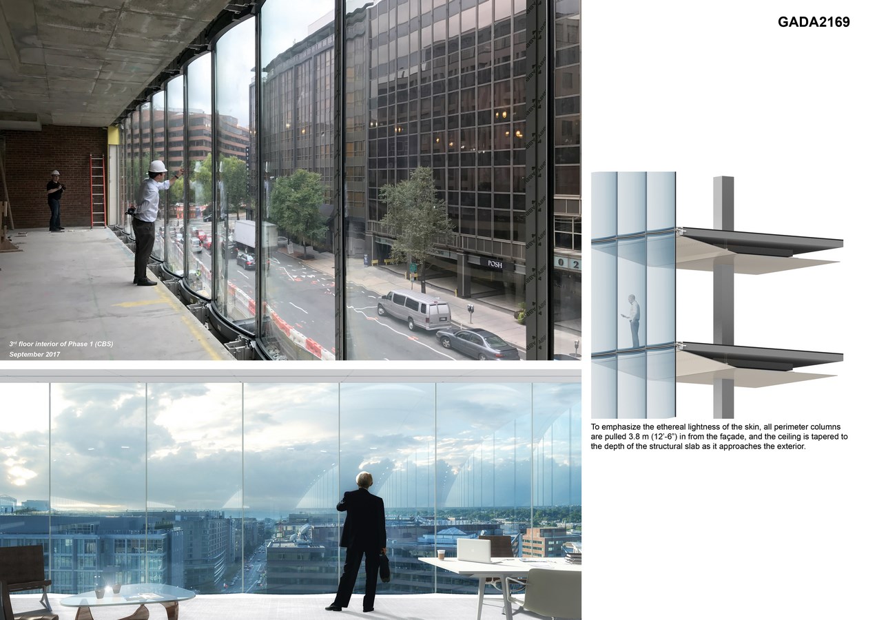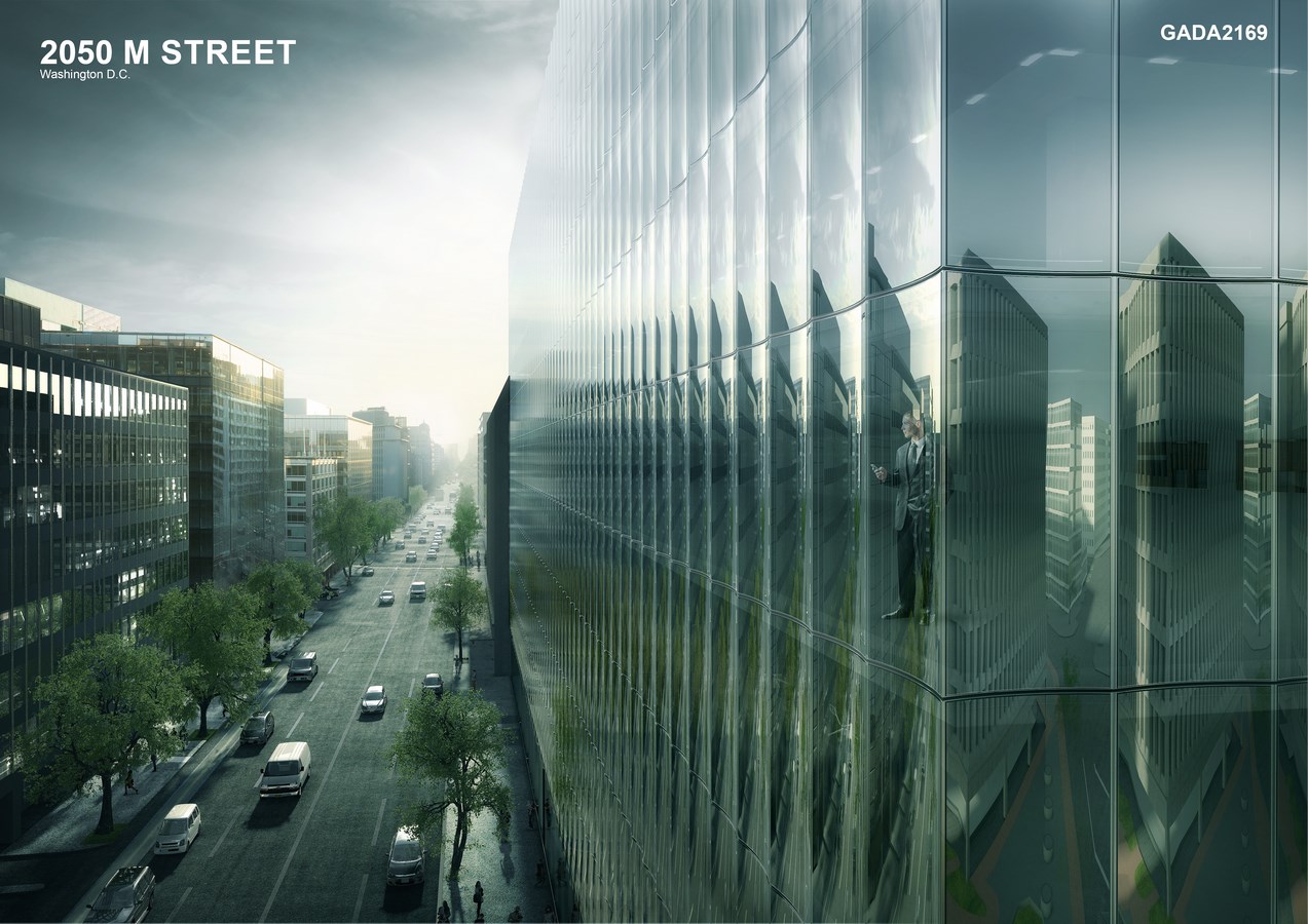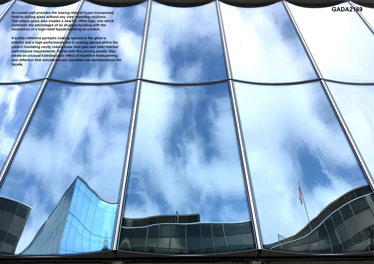 In this context, 2050 M Street maximizes its façade’s potential to set the new standard of trophy office space within the DC market. Its curtain wall provides the leasing ideal of hyper-transparent, floor-to-ceiling glass without any view-impeding mullions. The unique glass also creates a new DC office type, one which combines the advantages of an all-glass building with the modulation of a high-relief façade befitting its context.