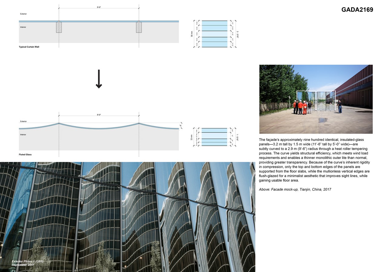 The façade’s approximately nine hundred identical, insulated-glass panels—3.2m tall by 1.5m wide (11’-6” tall by 5’-0” wide)—are subtly curved to a 2.9m (9’-6”) radius through a heat roller tempering process. The curve yields structural efficiency, which meets wind load requirements and enables a thinner monolithic outer lite than normal, providing greater transparency. Because of the curve’s inherent rigidity in compression, only the top and bottom edges of the panels are supported from the floor slabs, while the ‘mullion-less’ vertical edges are flush-glazed for a minimalist aesthetic that improves sightlines, while gaining useable floor area.