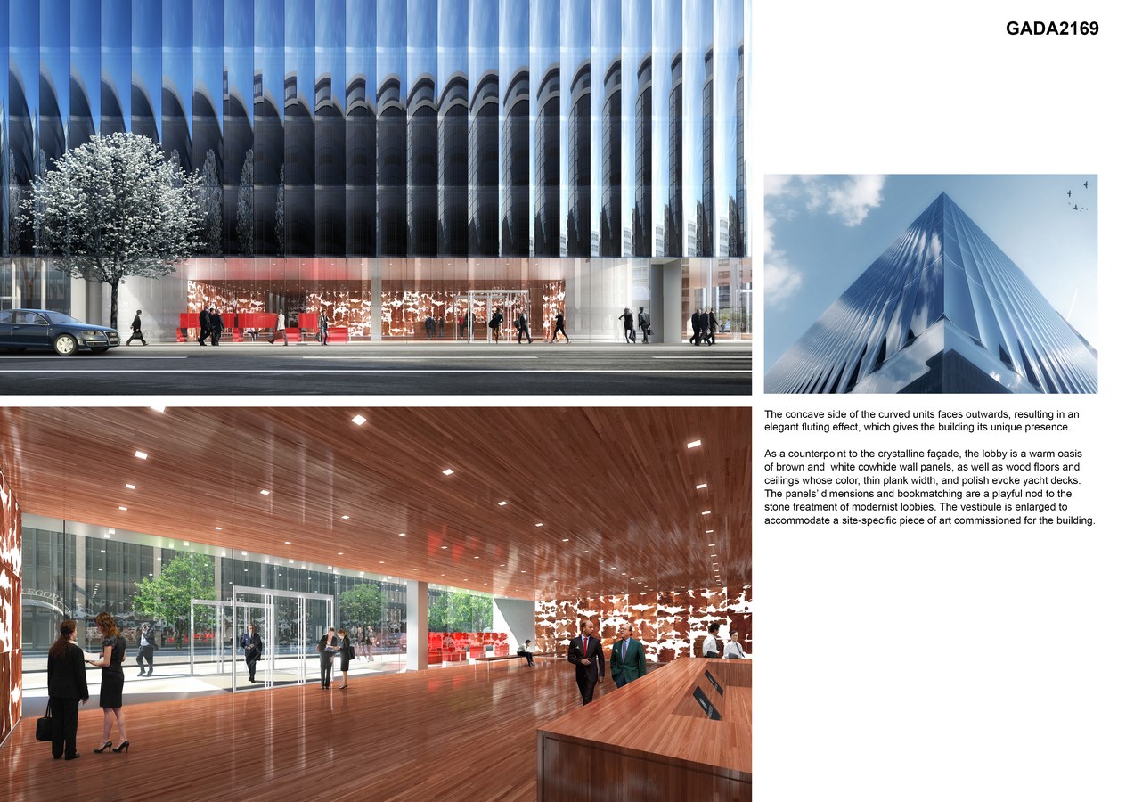 As a counterpoint to the crystalline façade, the lobby is a warm oasis of cowhide wall panels (whose dimensions, ironically, suggest stone), and wood floors and ceilings. The vestibule is enlarged to accommodate a site-specific piece of art commissioned for the building.