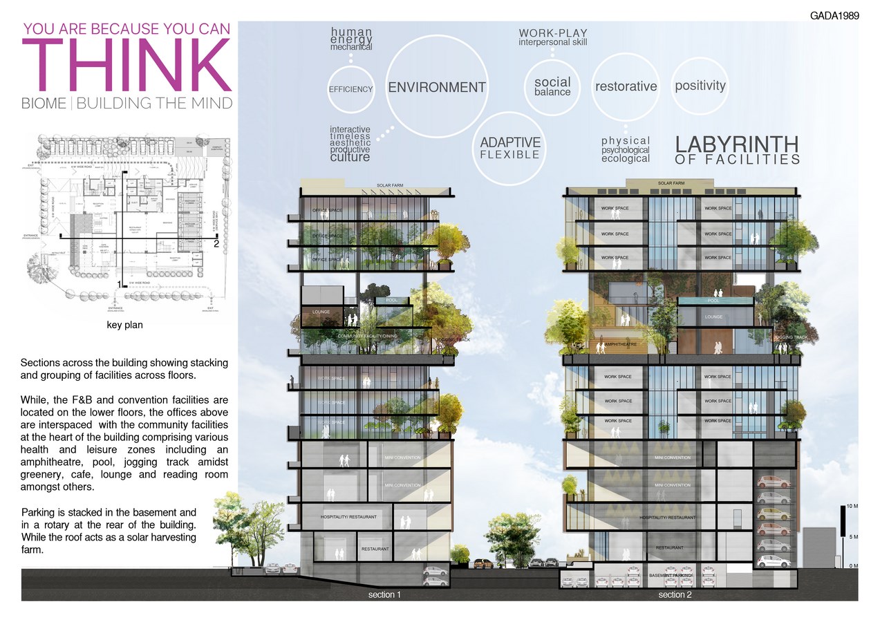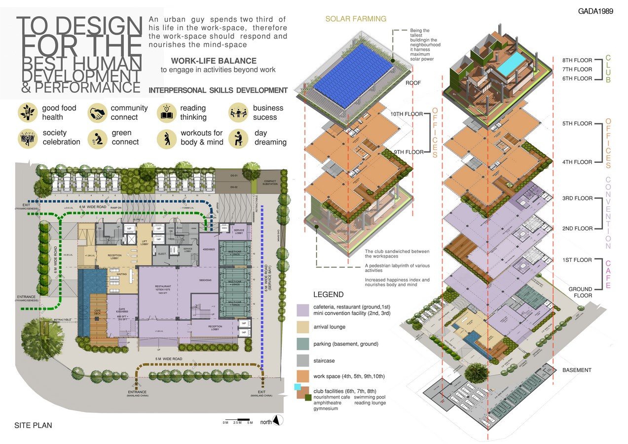 In the planning and design of this corporate office building, the Food and Beverages segment and mini convention facilities are located on the lower floors. The offices above are interspaced with the community facilities at the heart of the building comprising various health and leisure zones including an amphitheatre, pool, jogging track amidst greenery, cafe, lounge and reading room amongst others. Parking is stacked in the basement and in a rotary at the rear of the building while the roof acts as a solar harvesting farm.