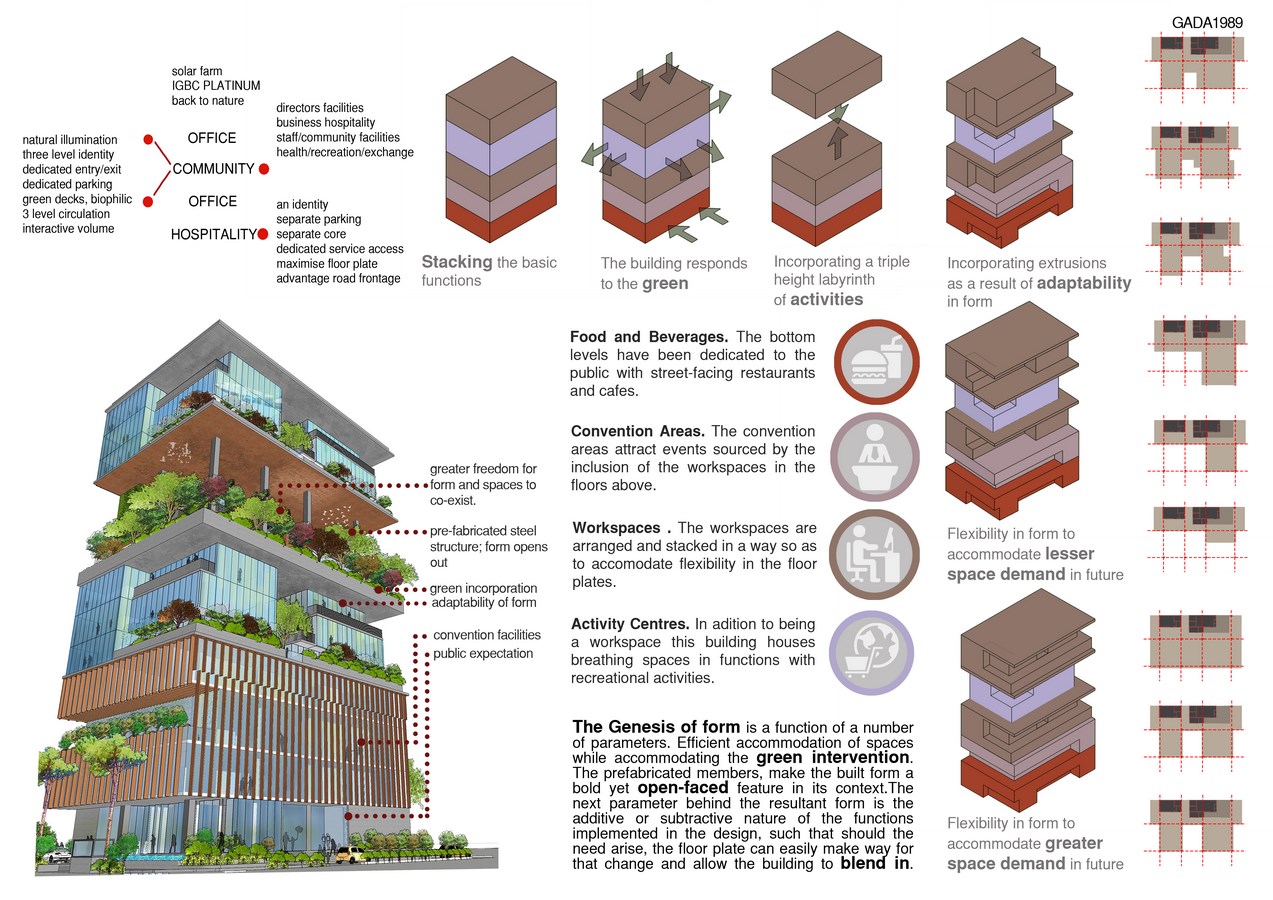 The Genesis of form is a function of a number of parameters. Efficient accommodation of spaces while accommodating the green intervention. The prefabricated members, make the built form a bold yet open-faced feature in its context. The next parameter behind the resultant form is the additive or subtractive nature of the functions implemented in the design, such that should the need arise, the floor plate can easily make way for that change and allow the building to blend in. The character of the building form and mass shall remain intact.