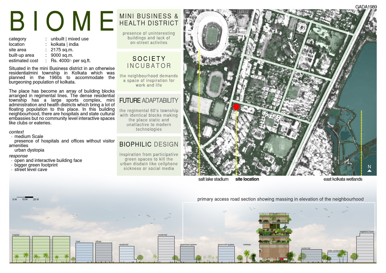 Situated in the mini Business district in an otherwise residential mini township in Kolkata which was planned in the 1960s to accommodate the burgeoning population of Kolkata, the place has become an array of building blocks arranged in regimental lines. The dense residential township has a large sports complex, mini administration and health districts which bring a lot of floating population to this place. In this building neighbourhood, there are hospitals and state cultural embassies but no community level interactive spaces like clubs or eateries.