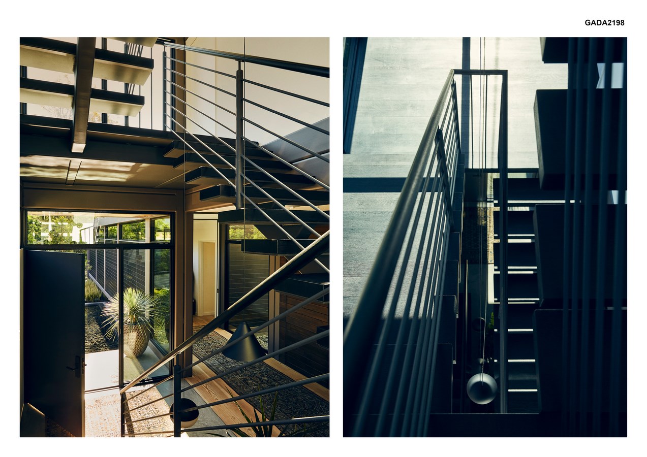 The landscape is designed for minimal water usage with native and drought tolerant plants. The existing hillside lot was covered in native oak tree, all maintained during construction with additional trees planted to provide shading for the home.