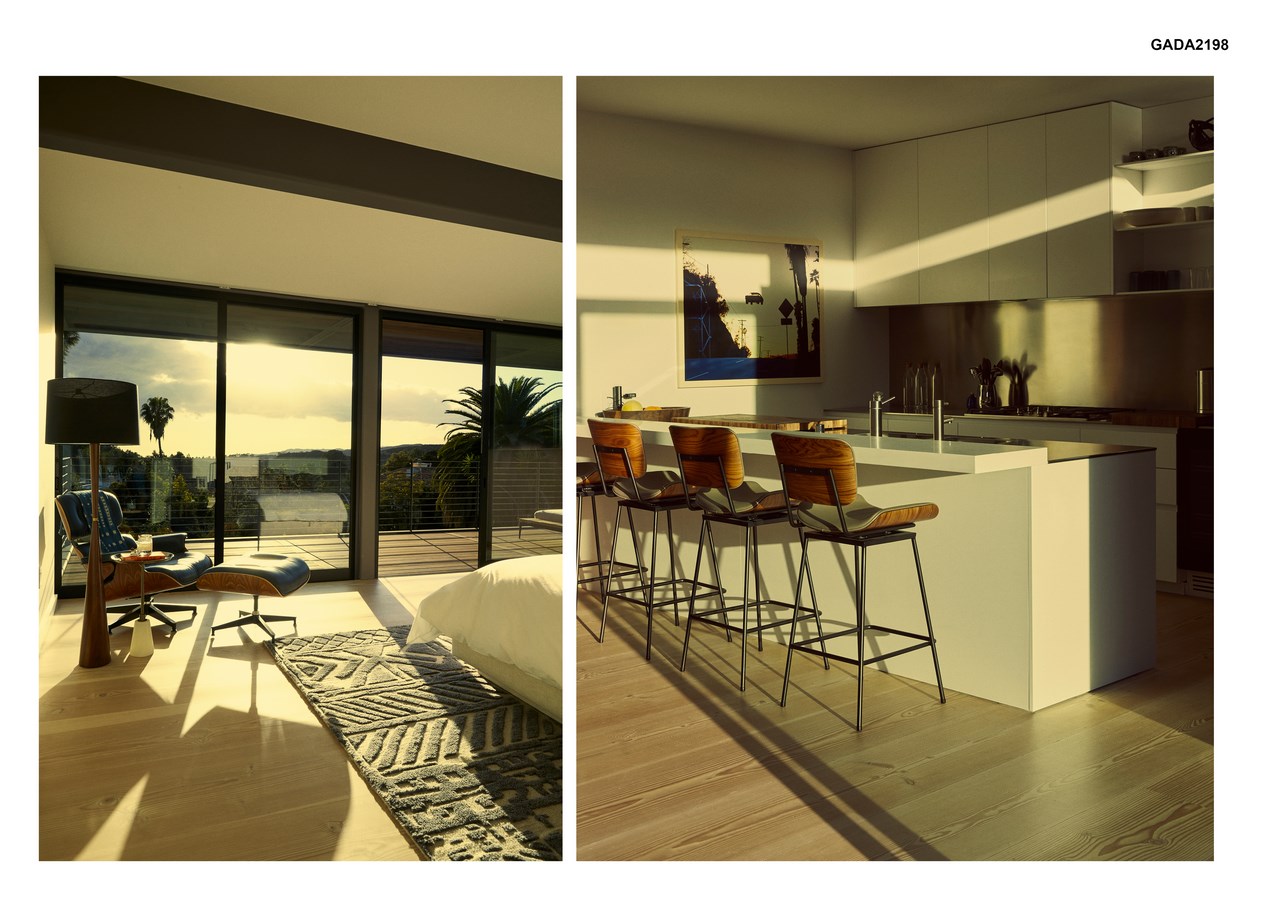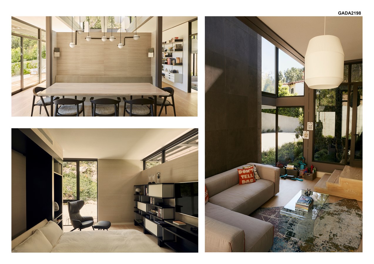 The interior design complements the mid-century exterior creating a flow of indoor space to outdoor space uniting both in the colors, textures, and materials. Soft textures, classic rugs, and cutting edge materials such as cast paper walls create a natural feel inside complementing the views into the canyons.